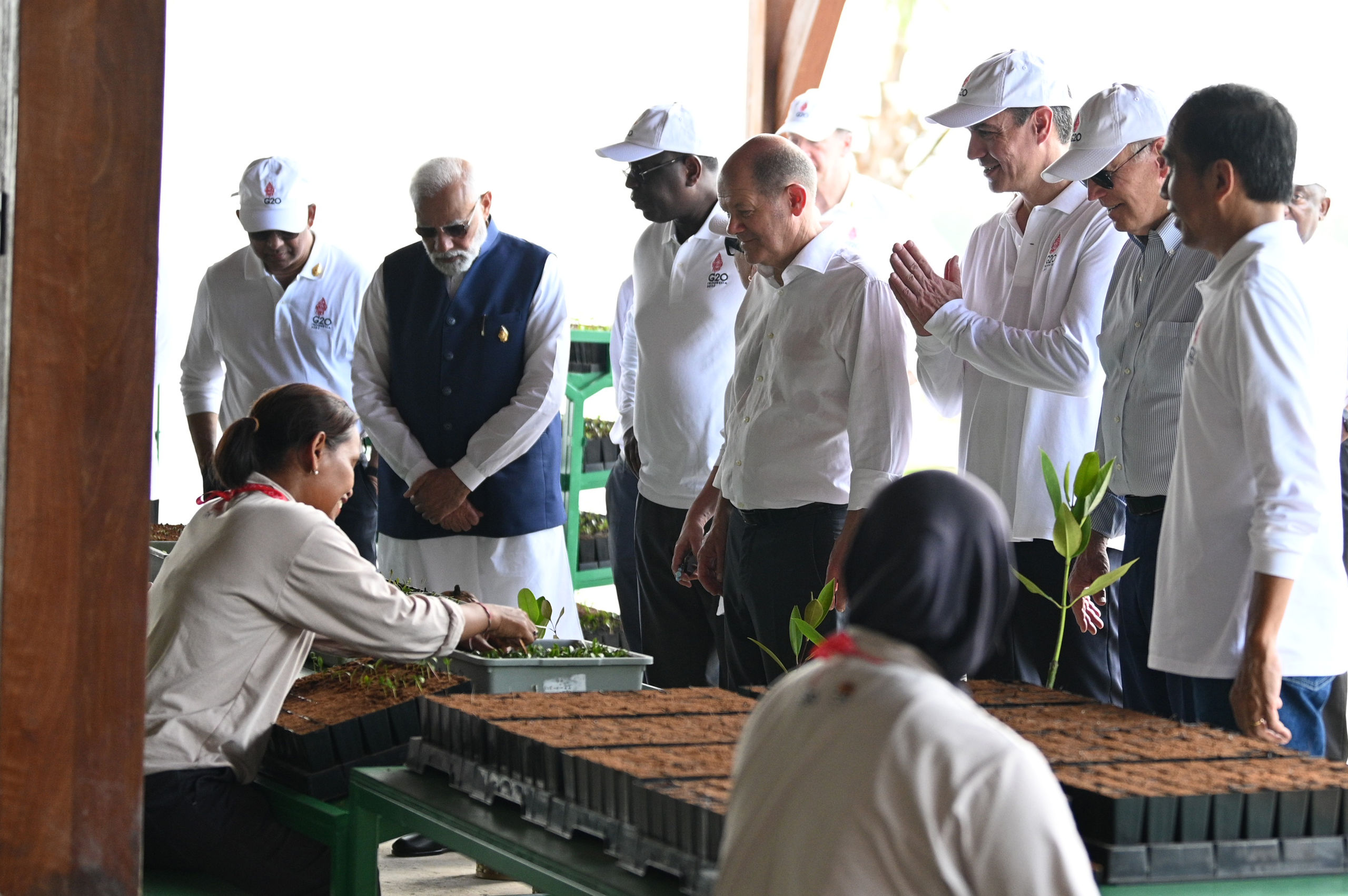 El presidente de los Estados Unidos, Joe Biden, el presidente del Gobierno de España, Pedro Sánchez, el canciller alemán, Olaf Scholz y el primer ministro indio Narendra Modi, durante una visita a una zona de siembra de manglares en el Parque Forestal de Manglares Tahura Ngurah Rai como parte de la reunión de los líderes del G20 en la Cumbre en Bali, Indonesia este miércoles.