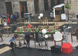 En 2017, unas figuras blancas estaban colocadas en lo alto de unos palos. En 2018, y siguiendo la tradición de Colau de ofender a los católicos por Navidad, el pesebre fue una mesa de comedor con doce sillas alrededor. En las sillas, elementos identificativos como el manto azul de la Virgen, un babero con el nombre de Jesús o el martillo de carpintero de San José, más los correspondiente halos de santidad, casi la única concesión a la tradición católica. También estaba el caganer, representado por una barretina y una silla con agujero; y no faltaban el buey y la mula, salvo que en un "giro de género" se trataba de una vaca y un burro, según el autor, Sebastiá Brosa.
