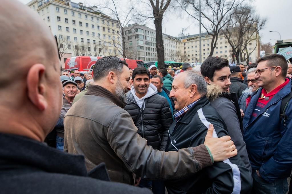 El presidente de Vox, Santiago Abascal, ha asistido a la manifestación de regantes del Levante español frente al Ministerio de Transición Ecológica, para mostrar su respaldo a los agricultores y ganadores que ven peligrar sus puestos de trabajo ante la reducción del caudal del agua para Alicante, Murcia y Almería.