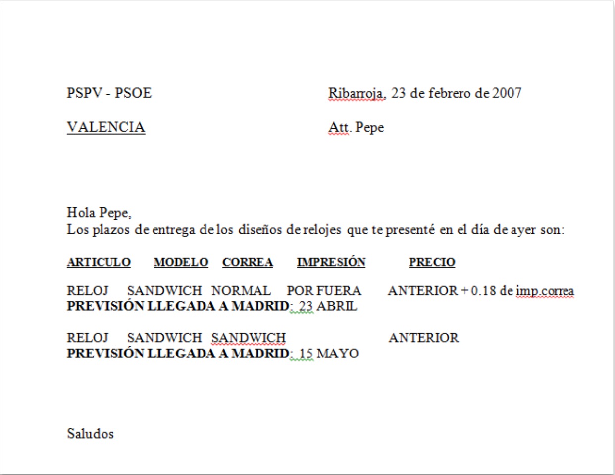 Aparentemente se trataba de un gran pedido de relojes baratos: "En el archivo denominado "P.S.O.E. 2007.xls", fechado atendiendo a sus metadatos el 11.04.2007, se recoge el número (20.000), color (blancos y rojos) y proveedor de los relojes (PIRCO IMPORT); apareciendo además en este caso bajo el epígrafe "PEPE CATALUÑA". Y, finalmente, según el archivo denominado "Listado entregas.xls", los relojes "habrían sido servidos en su totalidad a fecha del 16.05.2007. Pero en Madrid. Y eso hace sospechar de esta operación a la Guardia Civil.