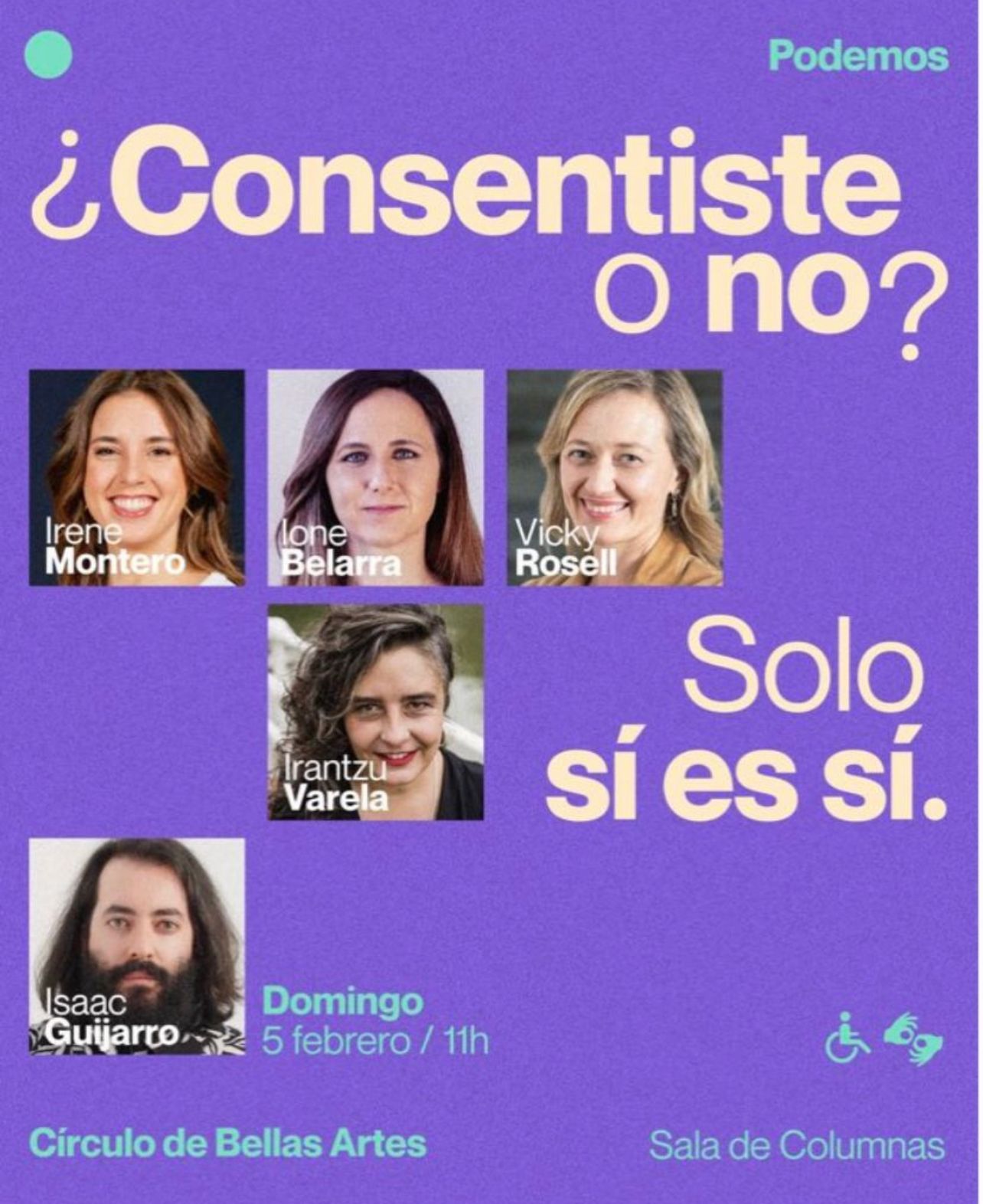 Bajo el título "Consentiste o no, Sólo sí es Sí", las tres se darán cita el próximo domingo a las 11.00 en el Círculo de Bellas Artes de Madrid, junto a activistas pertenecientes al entorno de Podemos, como son la periodista y feminista Irantzu Varela y el abogado Isaac Guijarro. A pesar de incluir a miembros del Gobierno, la estética de presentación corresponde con la de Unidas Podemos en lo que parece más un acto de partido en plena precampaña electoral.
