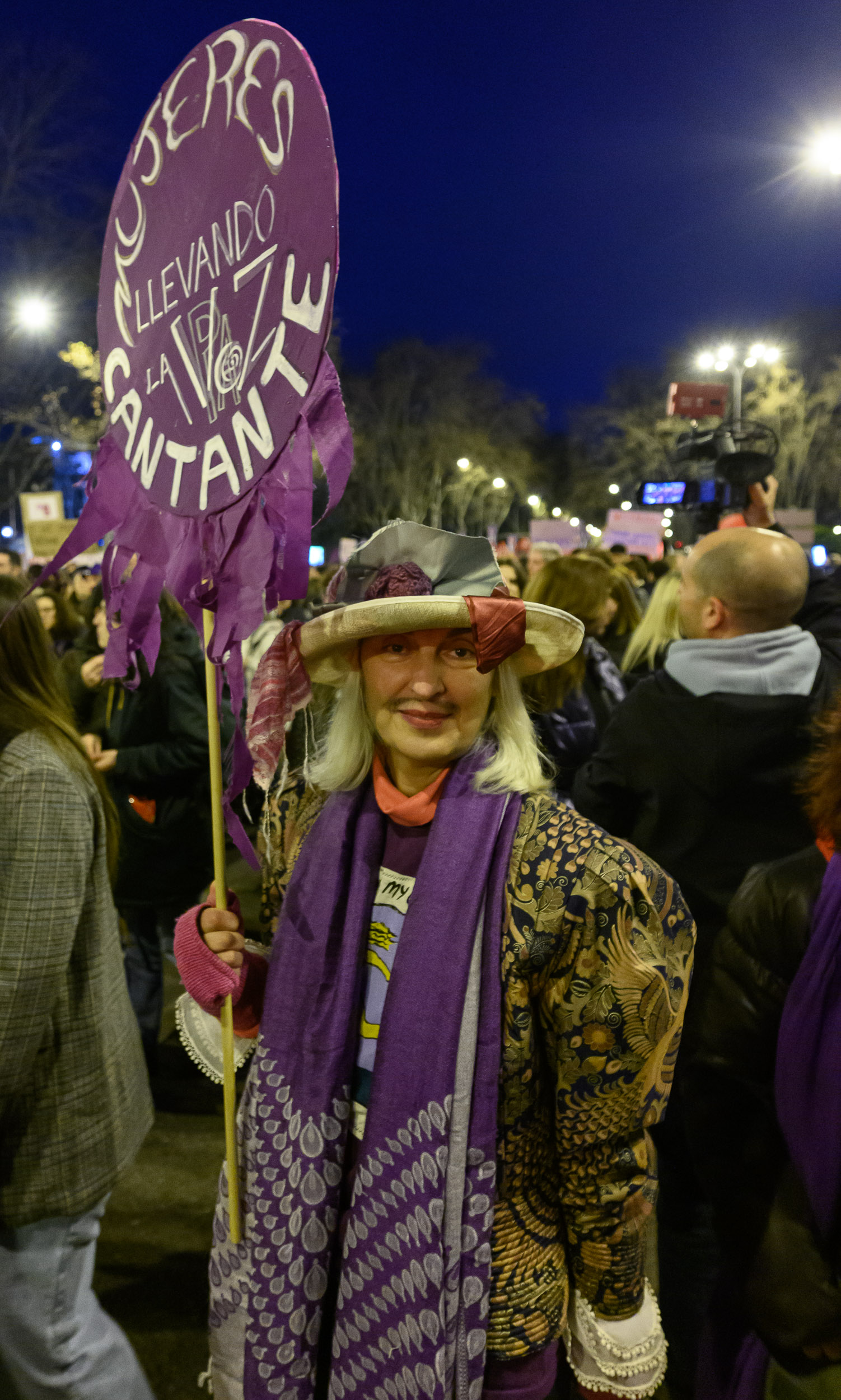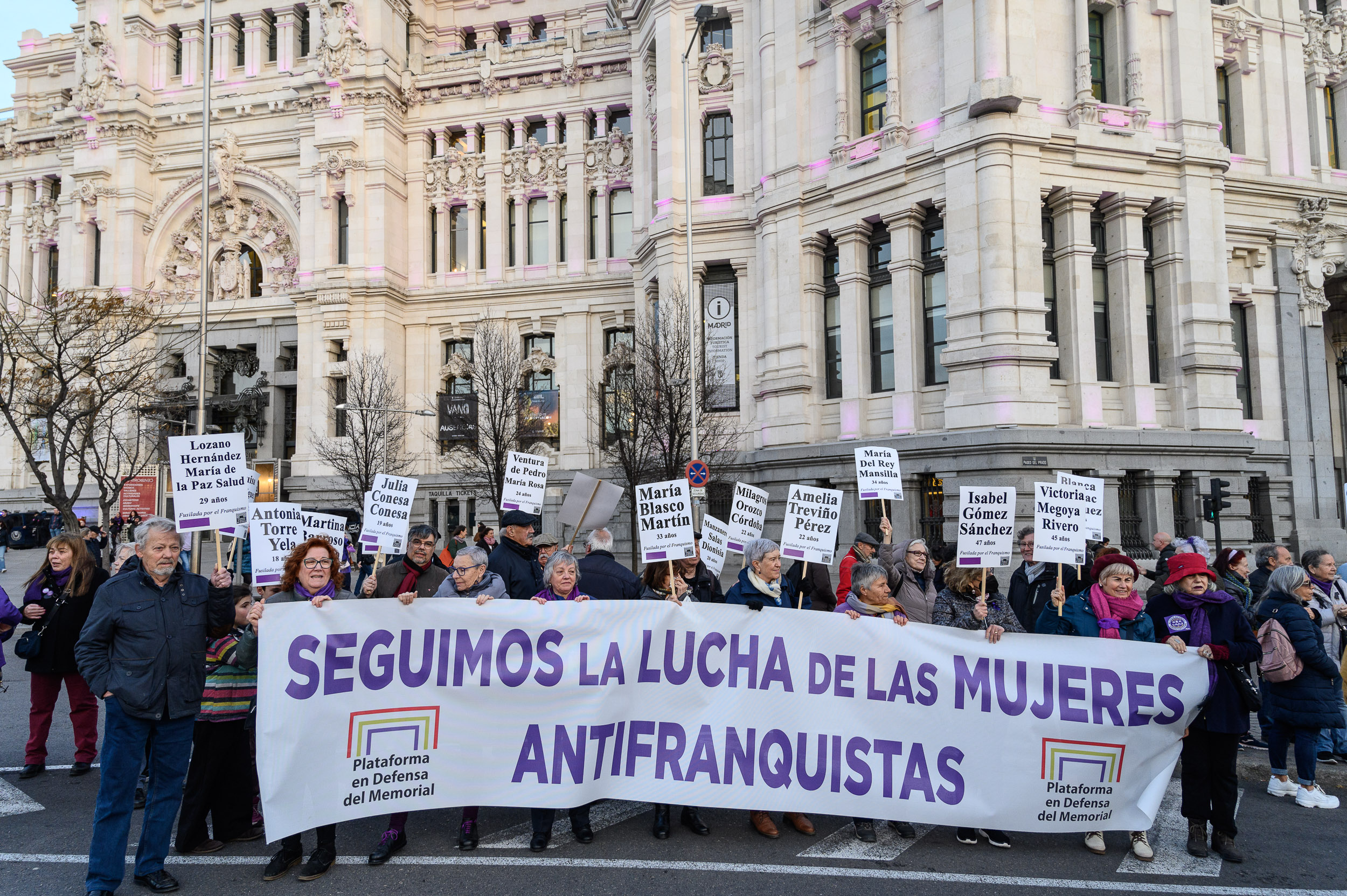 Un grupo de mujeres y hombres (al menos en apariencia) se manifiestan todos los años en la plaza de Cibeles por las mujeres antifranquistas.