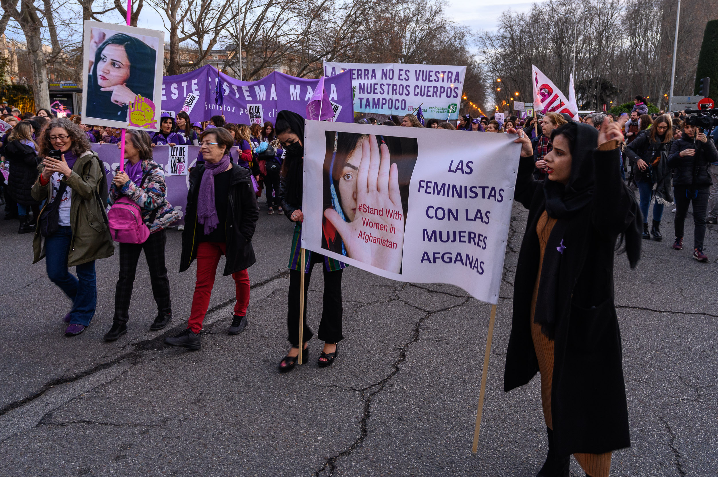 Un grupo muy pequeño de mujeres afganas ha tenido que soportar que detrás una pancarta dijese "este sistema mata" refiriéndose, por supuesto, al sistema que a ellas les gustaría tener para evitar ser asesinadas.