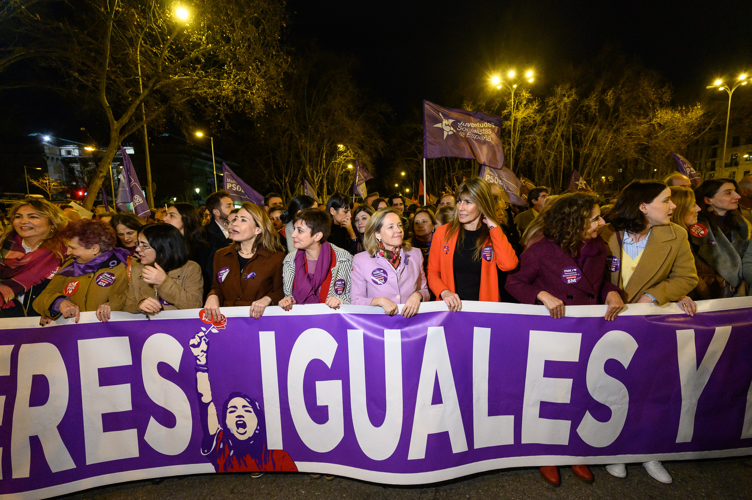 Las ministras socialistas y la titular de Igualdad, en dos bloques diferentes tras su pancarta, acuden a la manifestación oficial.
