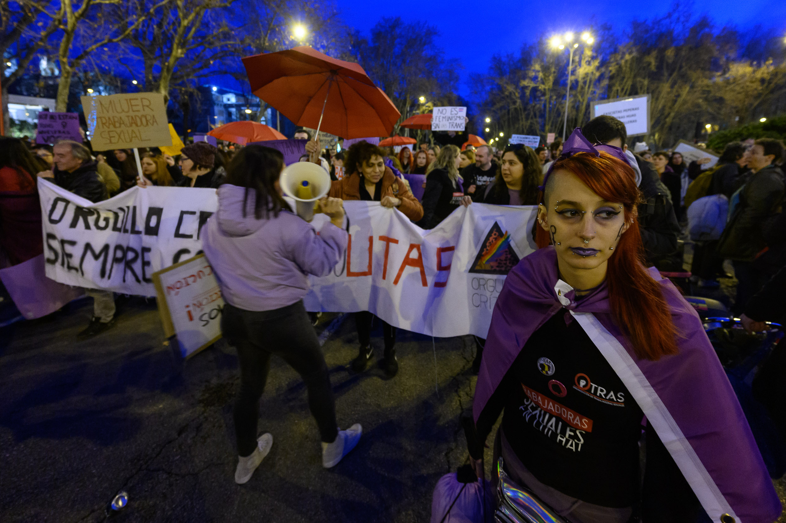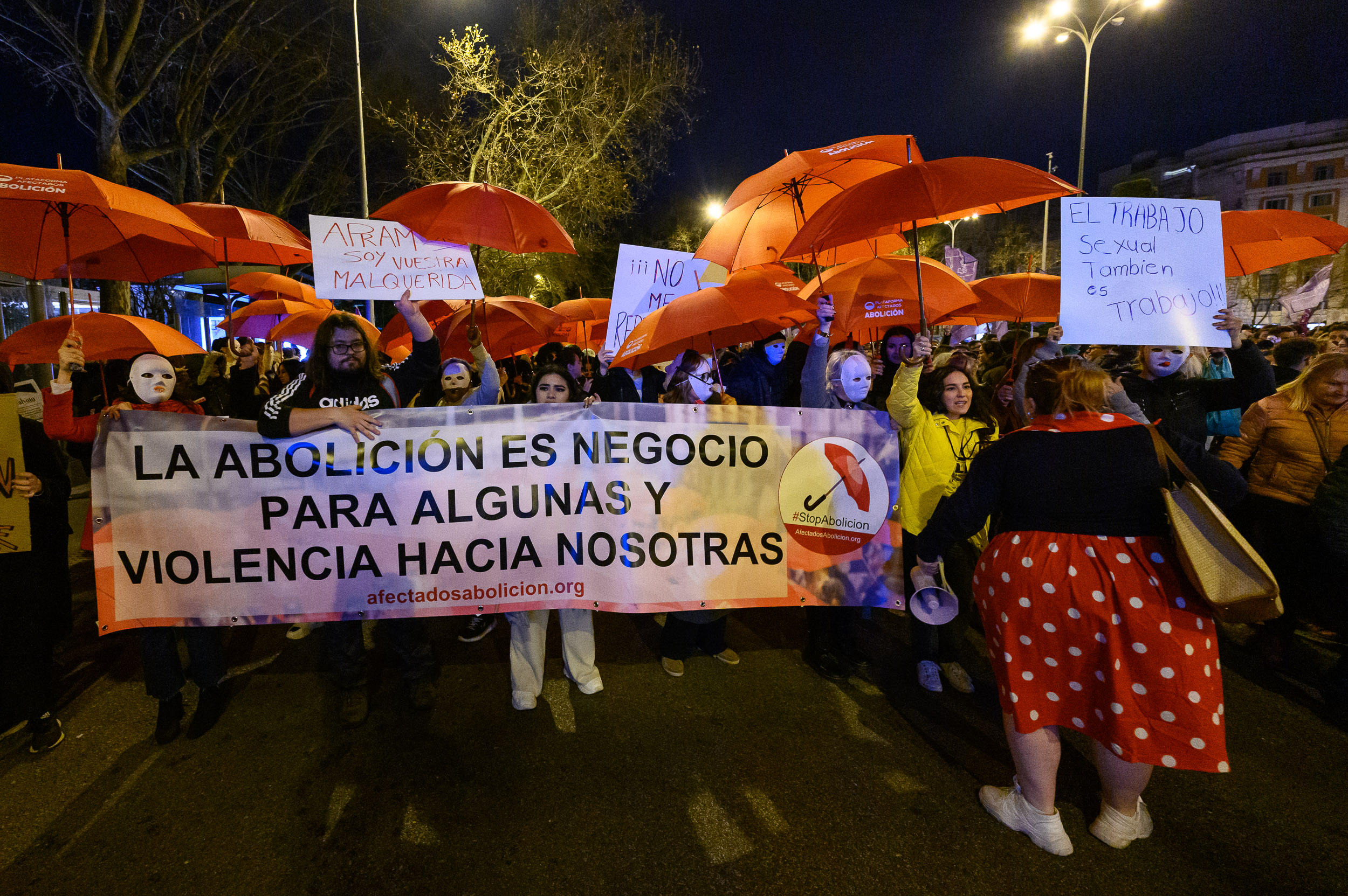 El mejor momento de la manifestación ha sido cuando un grupo de trabajadoras sexuales contra la abolición ha irrumpido ruidosamente junto a la cabecera del PSOE, silenciando a las socialistas que hasta ese momento estaban como en un homenaje a Raffaella Carrá de animadas.