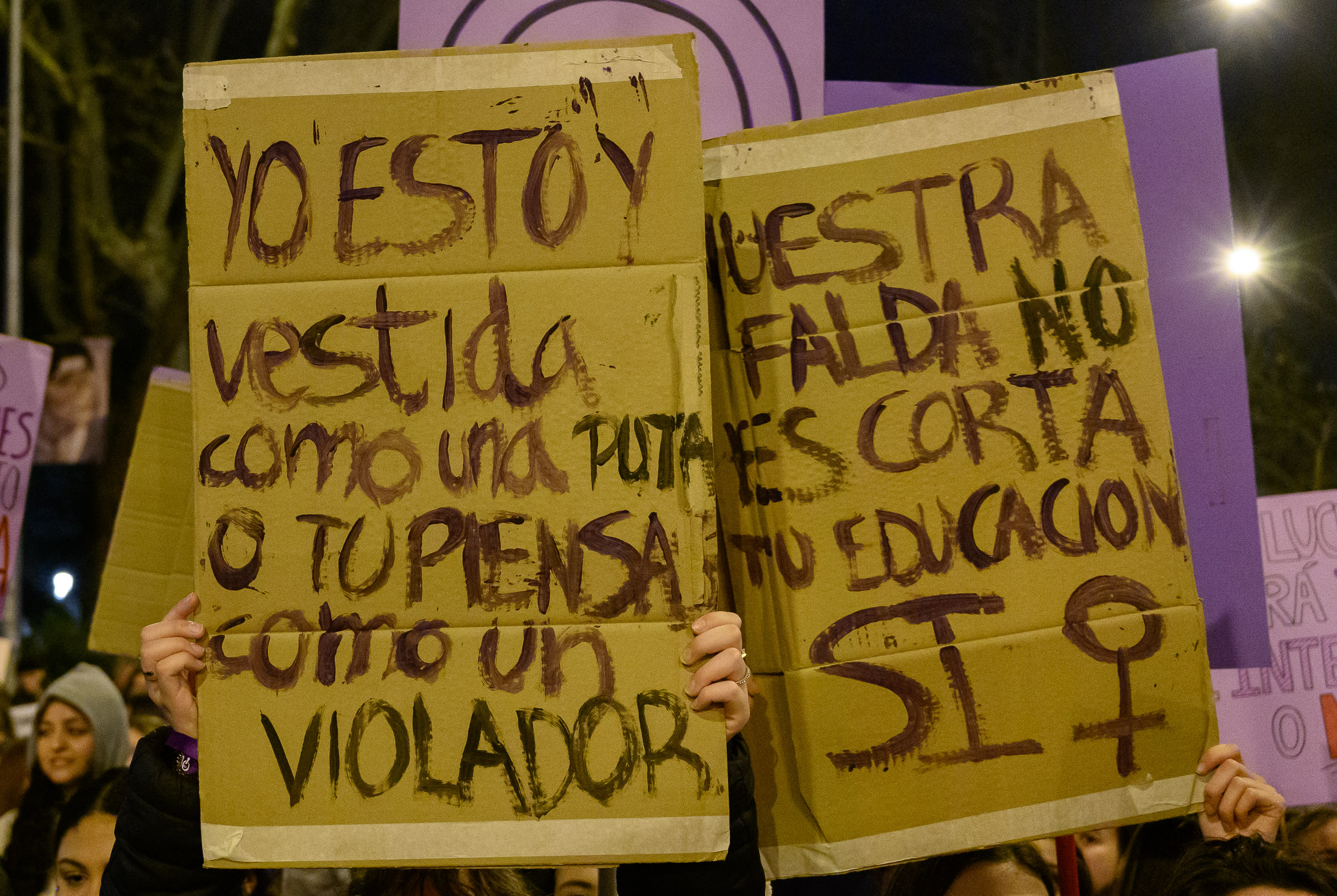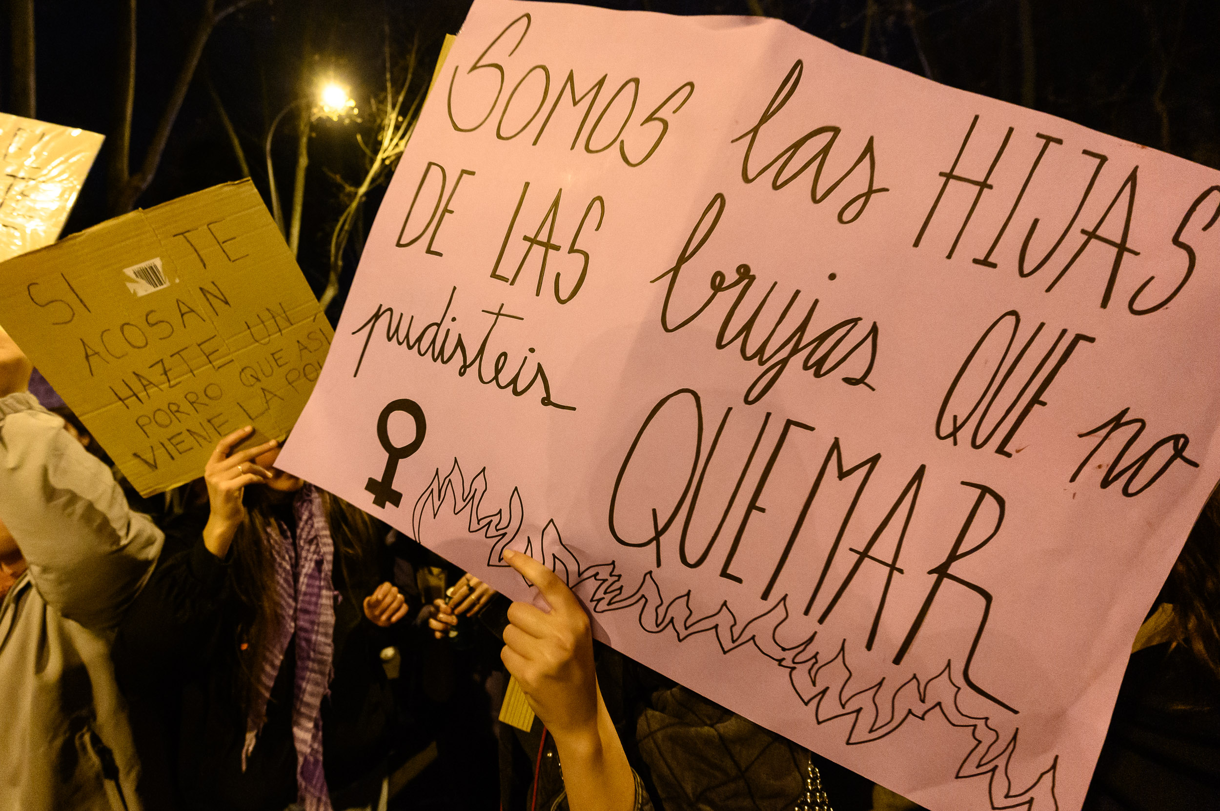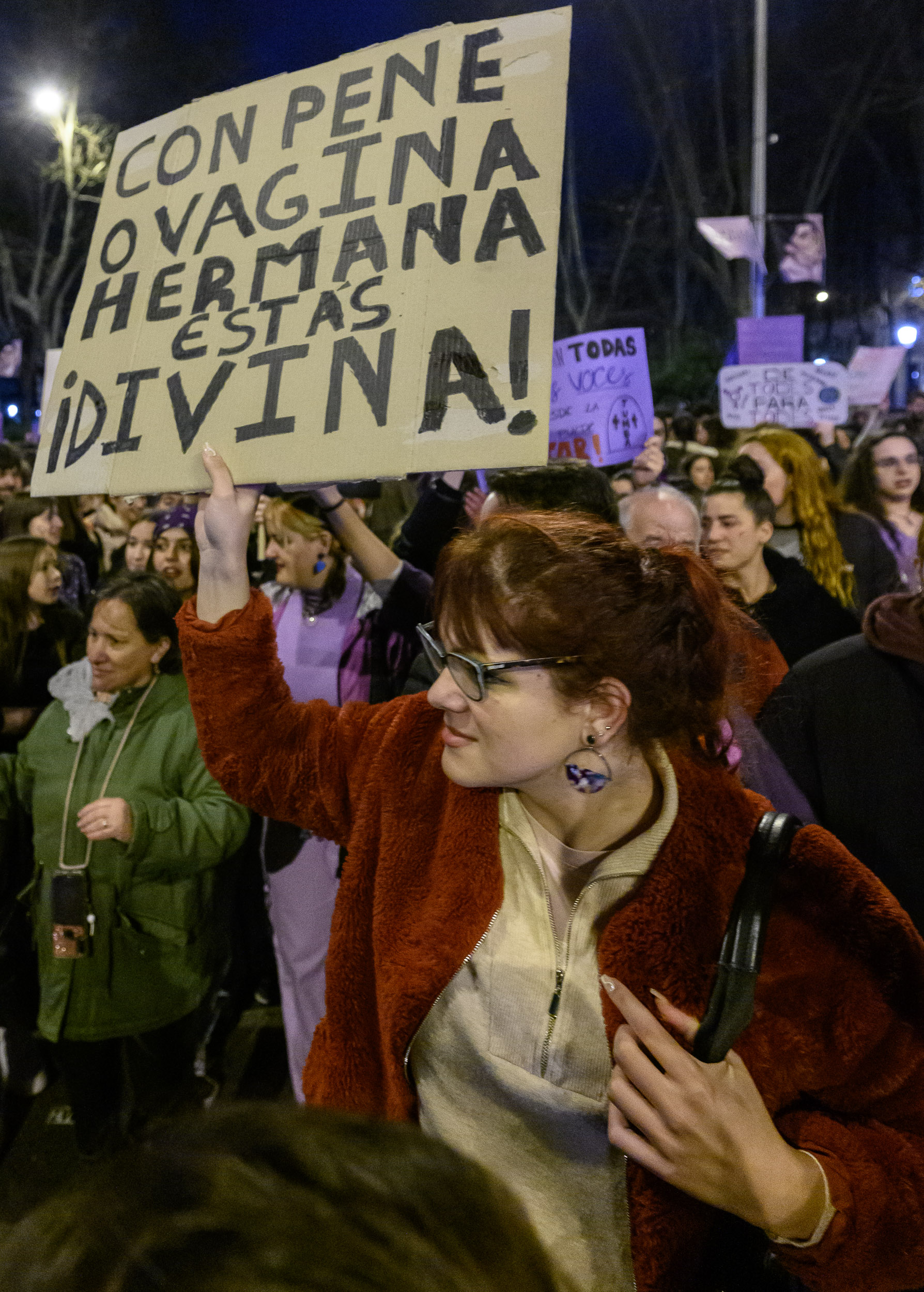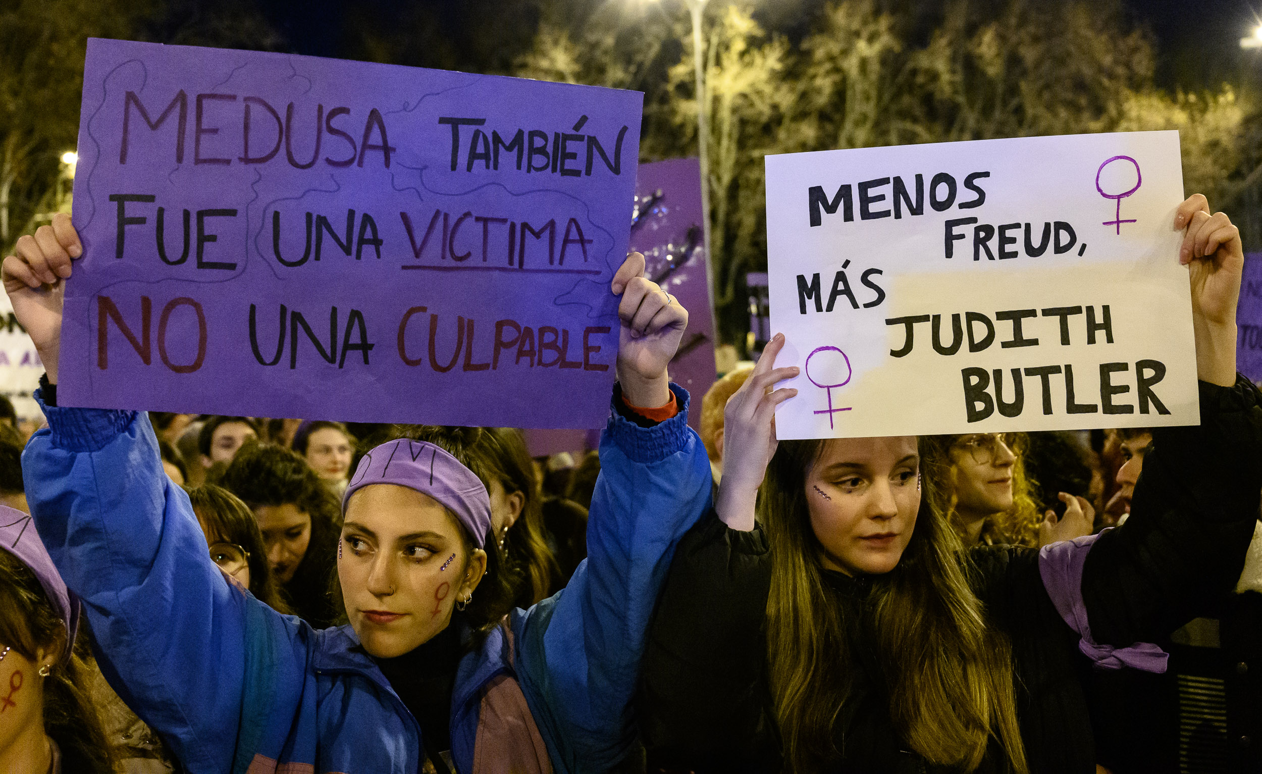 Una joven le pide a su hermana que le de la mano, pero tiene las dos en la pancarta, las contradicciones del feminismo.