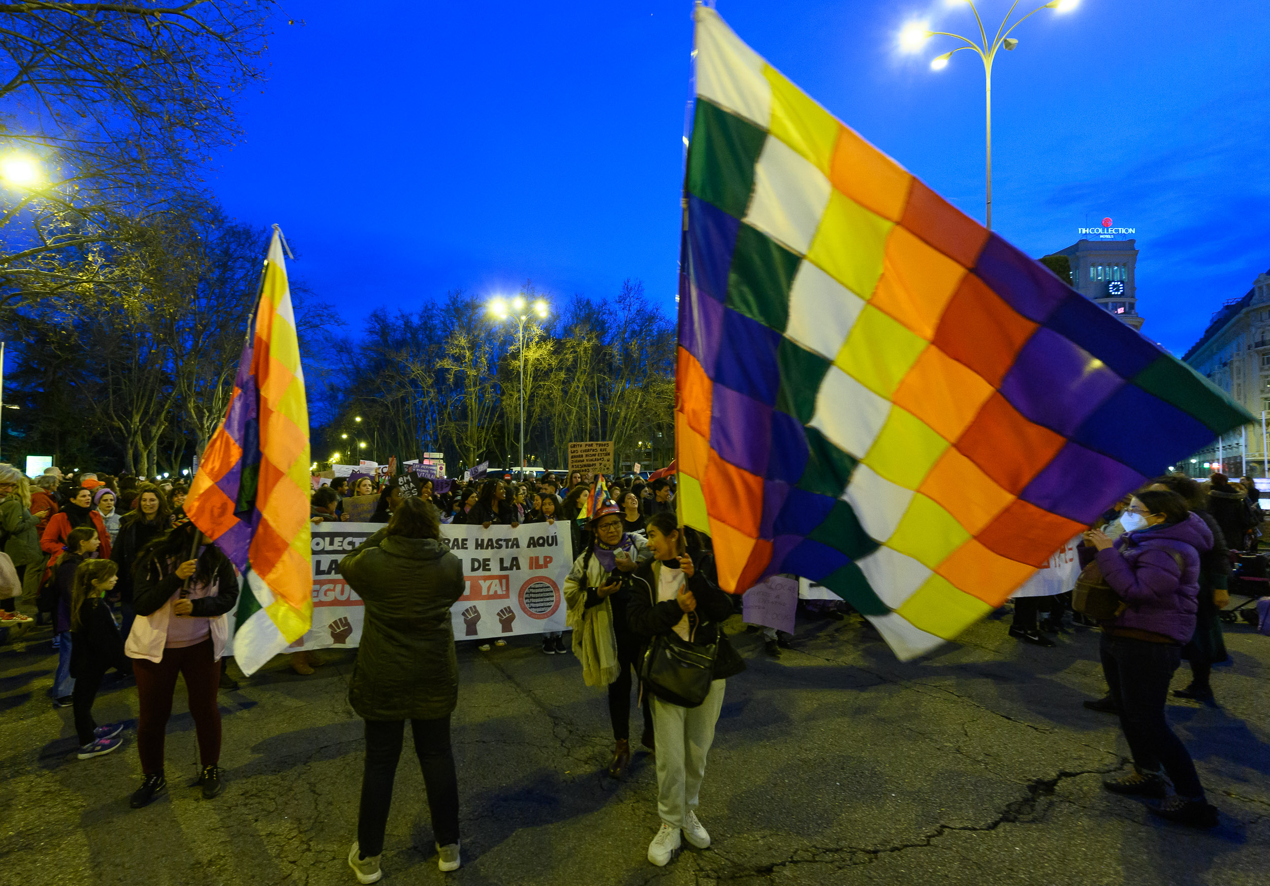 Banderas indigenistas que se ondeaban al grito de "¡papeles para todas o todas sin papeles!".