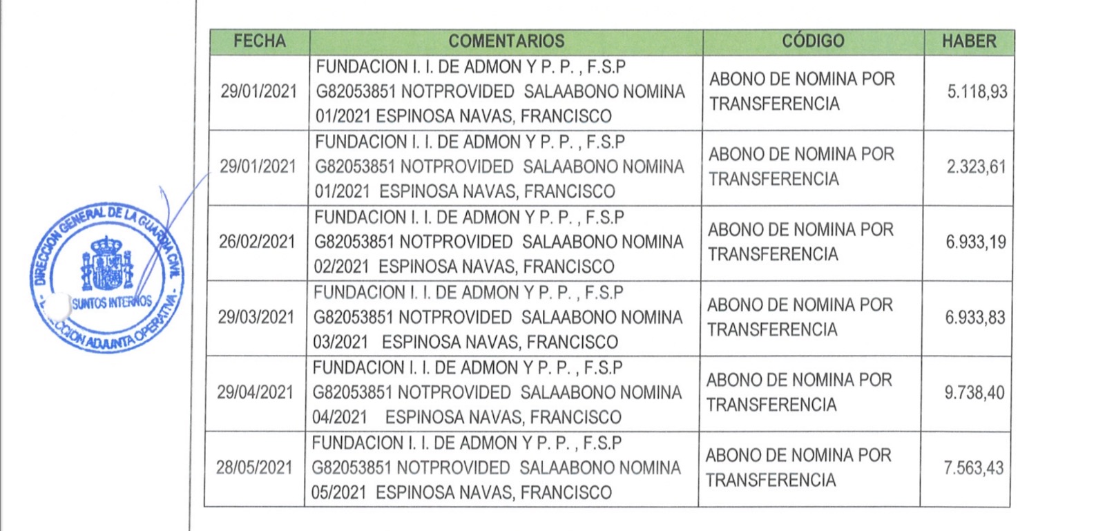 La Justicia ha accedido a "los movimientos de la cuenta XXXXX, de la entidad Banco Bilbao Vizcaya Argentaria, SA. cuya titularidad ostenta Espinosa" y ha chequeado los cobros recibidos por el general procedentes de la Fundación. "En el periodo comprendido entre enero y mayo del año 2021, éste continuó percibiendo mensualmente abonos por transferencia en concepto de nómina de la Fundación Internacional y para Iberoamérica de Administración Políticas Públicas (FIIAPP) de la que depende el Proyecto GARSI Sahel, por los siguientes importes", señala el informa de la Guardia Civil. Allí figuran pagos de 5.118,93 euros el 29 de enero de 2021; de 2.323,61 euros también en el mismo día de enero; de 6.933,19 euros el 26 de febrero de ese año; el 29 de marzo figura otro pago en concepto de "nómina por transferencia" de 6.933,83 euros; el 29 de abril, otros 9.738,40 euros; y el 28 de mayo del mismo 2021, 7.563,43 euros.