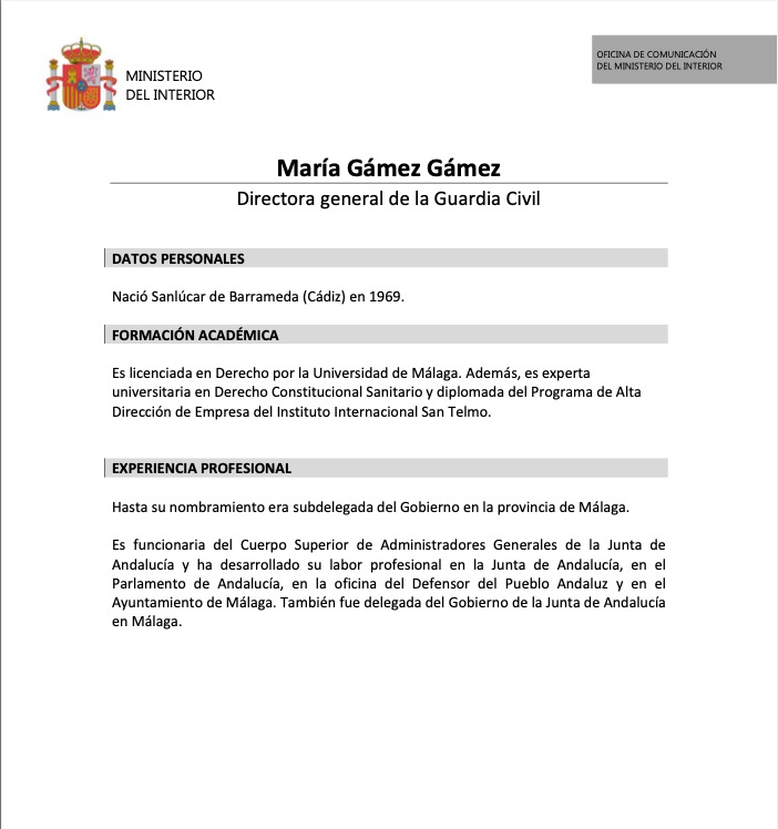 El CV ofrecido en su web de presentación por el Ministerio del Interior hasta el momento de la dimisión de María Gámez como directora de la Guardia Civil señalaba lo siguiente: