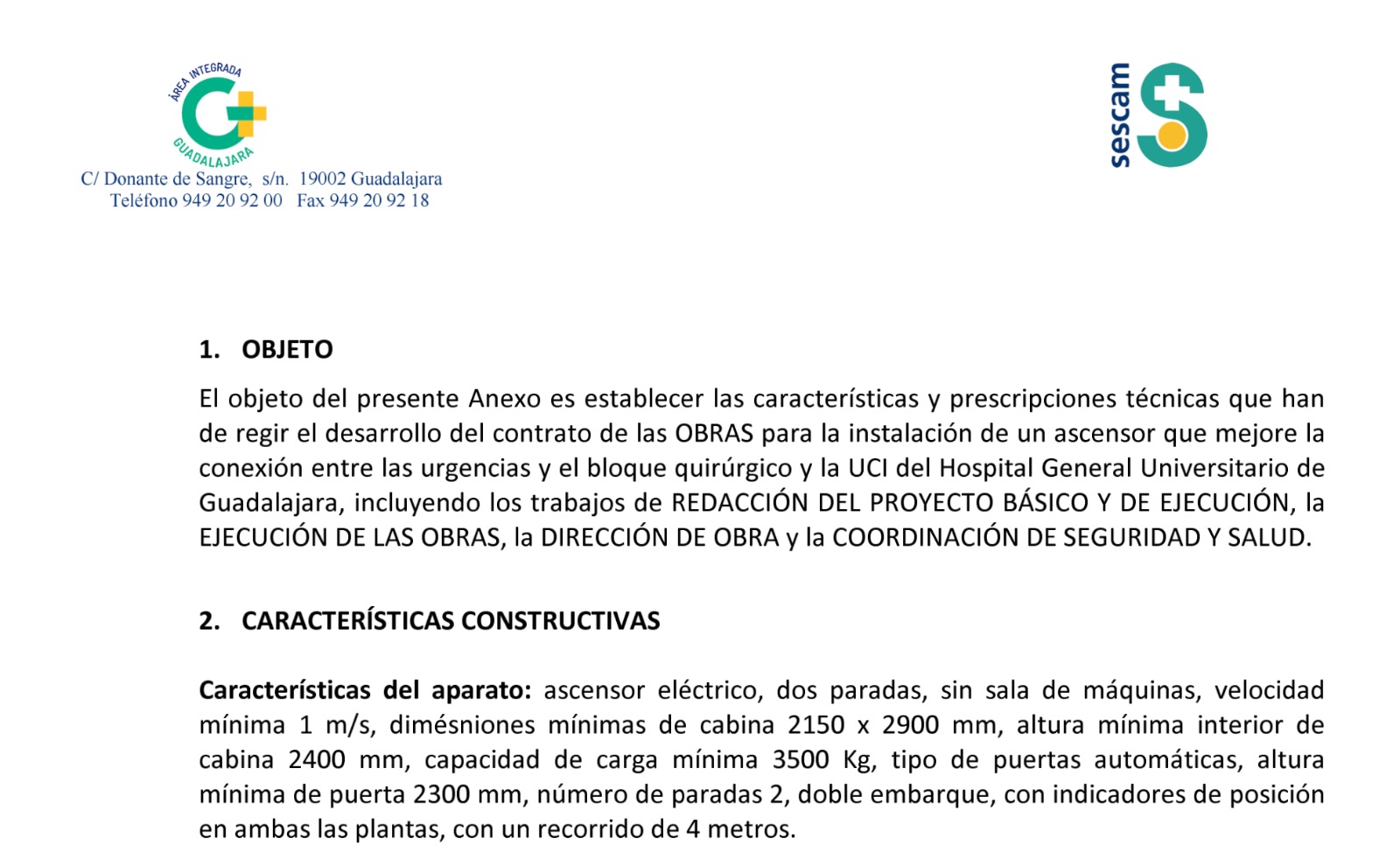 Los documentos justificativos de la contratación de urgencia, a los que ha tenido acceso Libertad Digital, dan una idea de la improvisación tras catorce años de reformas y obras en el Hospital de Guadalajara. "El Servicio Sanitario de Castilla-La Mancha, en el ámbito de las competencias sanitarias que le han sido trasferidas, ha asumido los compromisos de construcción y equipamiento de los centros de atención sanitaria", señala el documento sellado el 6 de febrero pasado y firmado por el director gerente, Antonio Sanz Villaverde. "El servicio de Urgencias del Hospital Universitario de Guadalajara se trasladó al edificio de la ampliación en septiembre de 2022. Es imprescindible la construcción de un elevador que mejore la conexión entre el servicio de Urgencias, UCI y el bloque quirúrgico fundamentalmente. Sin el mismo, sería muy difícil el traslado del resto de los servicios a su nueva ubicación y retrasaría toda la actividad asistencial prevista", explica el documento sin contar la realidad: que han diseñado un ascensor en el que no caben las camillas del hospital. "Por todo lo anterior, se considera de interés público la ejecución de las obras de este elevador en la ampliación del Hospital Universitario de Guadalajara, junto con la redacción del correspondiente proyecto de ejecución de las mismas", añade el texto.