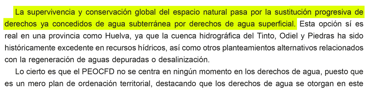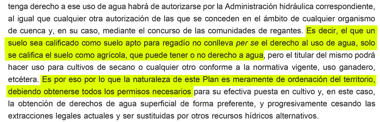 "El proyecto no se centra en ningún momento en los derechos de agua, puesto que es un mero plan de ordenación territorial, destacando que los derechos de agua se otorgan en este ámbito por cada una de las administraciones y demarcaciones competentes", reza la explicación de motivos. "El que un suelo sea calificado como suelo apto para regadío no conlleva per se el derecho al uso de agua, solo se califica el suelo como agrícola, que puede tener o no derecho a agua (…) —insiste más adelante—. Es por eso por lo que la naturaleza de este Plan es meramente de ordenación del territorio, debiendo obtenerse todos los permisos necesarios para su efectiva puesta en cultivo".