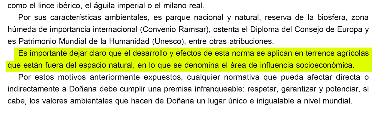 Es más, a lo largo de las más de 20 páginas en las que se explican las medidas a aprobar, se reitera hasta la saciedad que "el desarrollo y efectos de esta norma se aplican en terrenos agrícolas que están fuera del espacio natural, en lo que se denomina el área de influencia socioeconómica". Es decir, en municipios cercanos, pero en suelos que no están protegidos.