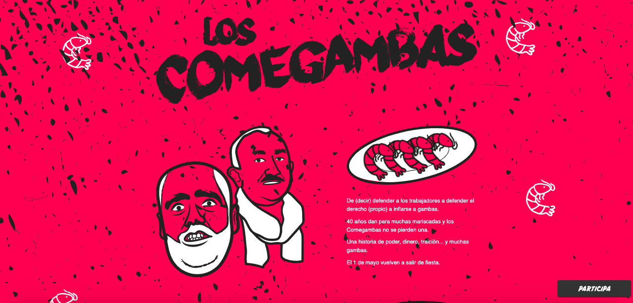Solidaridad ha creado también la web comegambas.org en la que utiliza una estética de cómic para criticar duramente a ambos sindicatos con caricaturas de sus secretarios generales, Unai Sordo y Pepe Álvarez, a los que acusa de haber pasado de "decir que defienden a los trabajadores a inflarse a gambas", para llamar a la movilización el próximo 1º de Mayo en la manifestación que el sindicato ha convocado en la Plaza de Chamberí.