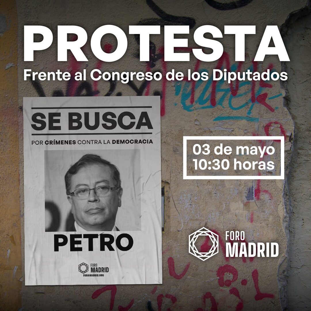 La fundación de Vox, a través de Foro Madrid, ha convocado una protesta frente al Congreso de los Diputados el próximo miércoles para criticar la visita oficial del presidente de Colombia, Gustavo Petro, que ese día comienza su viaje a España, donde será recibido con alfombra roja por Pedro Sánchez.