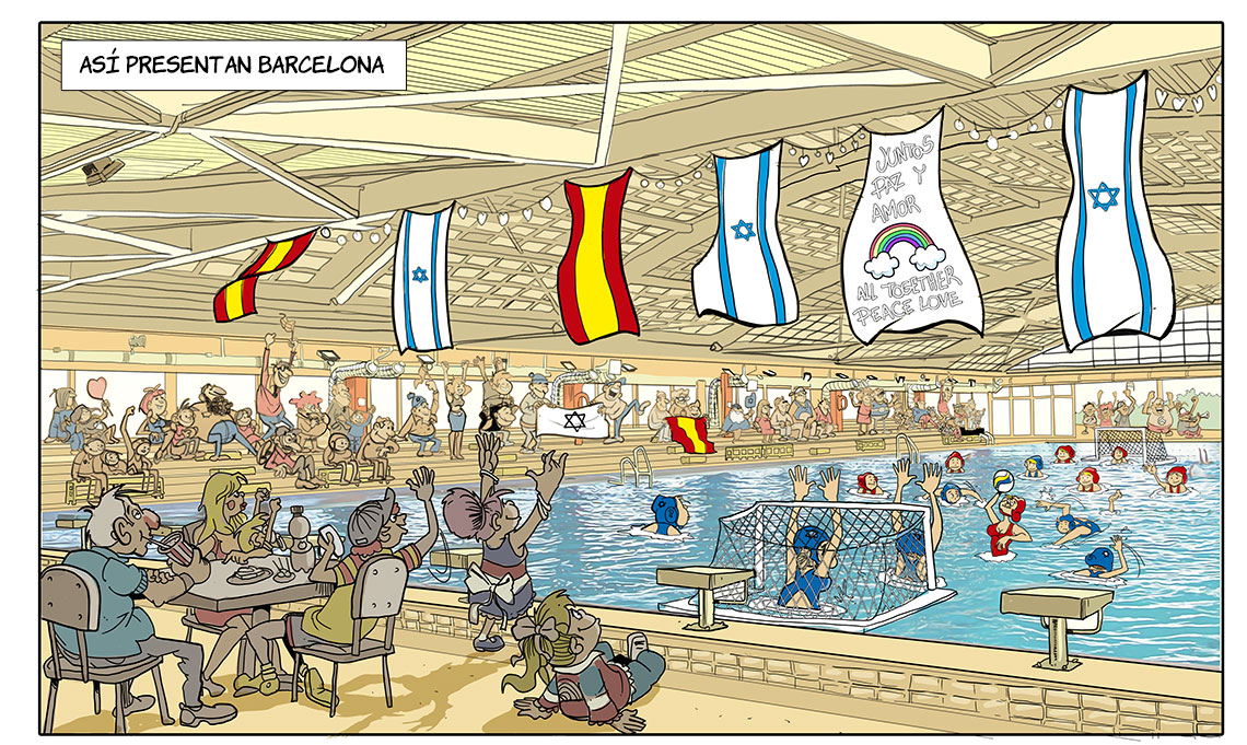 La asociación Acción y Comunicación en Oriente Medio (ACOM) ha publicado una serie de viñetas en las que contrasta como "presentan Barcelona" los partidos izquierdistas y separatistas y cómo es en realidad la ciudad. La primera hace referencia a la visita de la selección israelí de waterpolo femenino, en noviembre de 2018...
