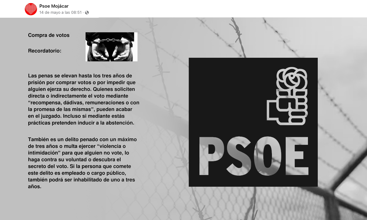 "Recordatorio: las penas se elevan hasta los tres años de prisión por comprar votos o impedir que alguien ejerza su derecho -comenzaba la nota que todavía continúa publicada en su página de Facebook-. Quienes soliciten directa o indirectamente el voto mediante recompensa, dádivas, remuneraciones o con la promesa de las mismas, pueden acabar en el juzgado. Incluso si mediante estas prácticas pretenden inducir a la abstención". Además, se subrayaba que "si la persona que comete este delito es empleado o cargo público también podrá ser inhabilitado de 1 a 3 años".