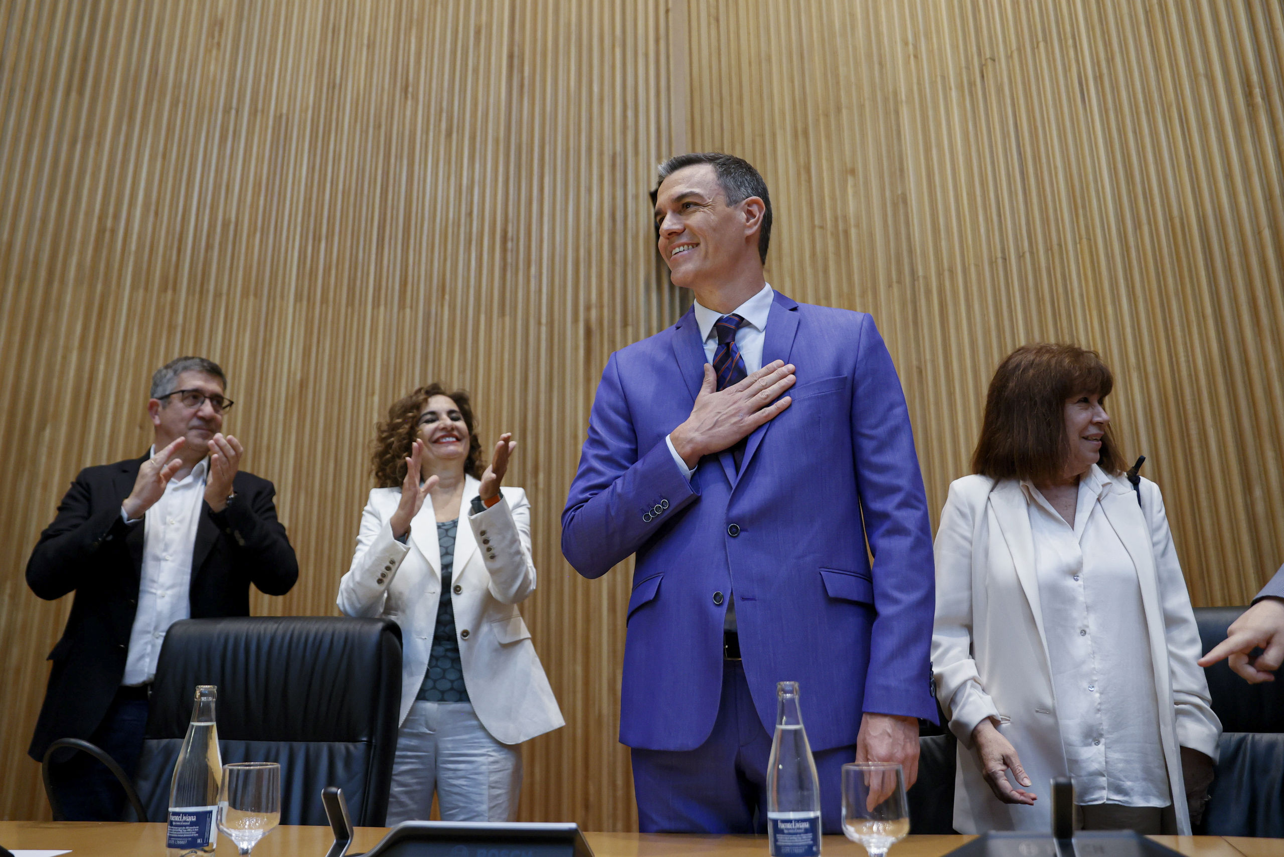 Pedro Sánchez se ha reunido este miércoles en el Congreso con diputados y senadores. A pesar de que el encuentro llegaba tras una derrota histórica en las municipales y autonómicas, arrollado por el PP en Ayuntamientos como Sevilla y regiones como Baleares, Comunidad Valenciana y Aragón, los parlamentarios le han recibido en pie, con aplausos y ovaciones.