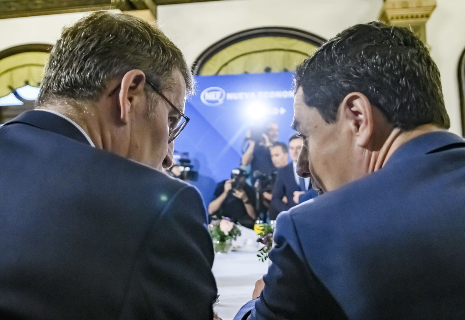Alberto Núñez Feijóo ha protagonizado esta mañana un desayuno informativo de Nueva Economía Fórum en Sevilla, junto al presidente de la Junta de Andalucía, Juanma Moreno, en el que ha criticado duramente a Yolanda Díaz, cuando las encuestas sitúan a Sumar y Vox en disputa para hacerse con la tercera plaza. "Yo no sería capaz de dejar tirada a un miembro de mi gobierno después de vitorearla, dejándola en el más absoluto ostracismo", ha dicho.