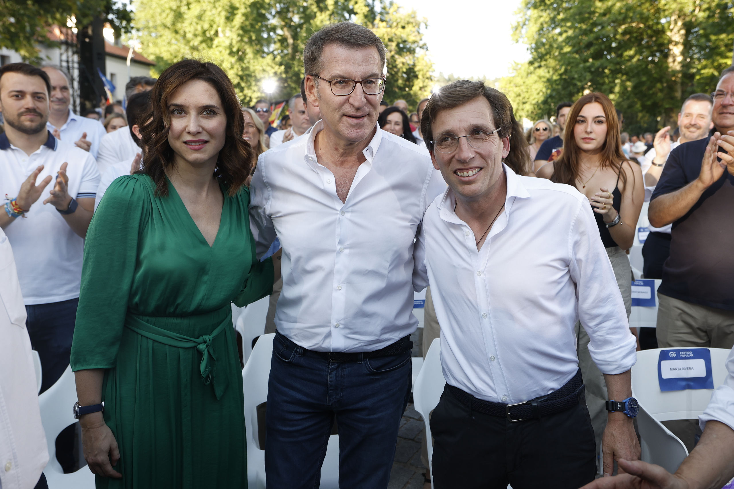 La presidenta madrileña recibía una gran ovación a su llegada al acto, celebrado en Madrid Río, donde se han congregado alrededor de 5.000 personas, según datos facilitados por el partido. A ella se ha dirigido Feijóo para dedicarle unas emotivas palabras y agradecerle su trabajo, al igual que a Almeida.