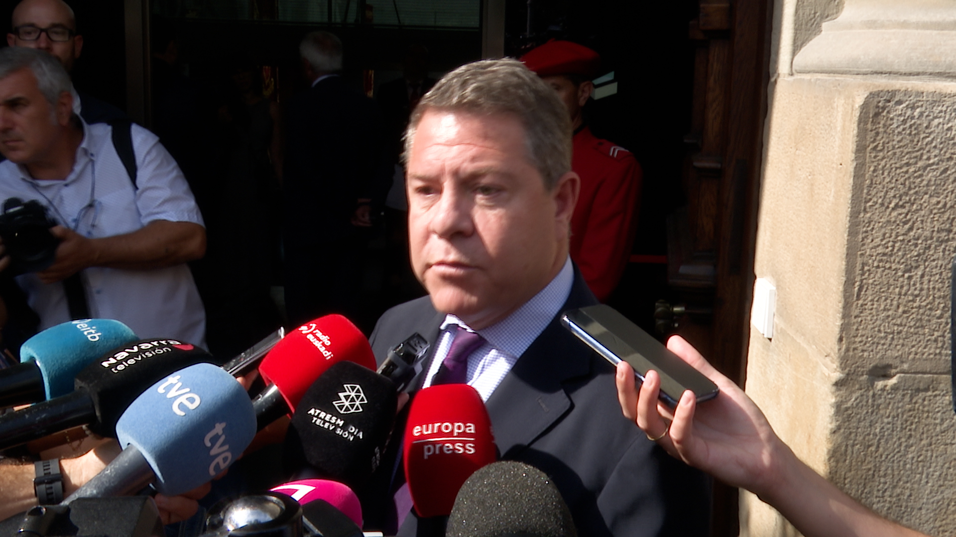 Declaraciones del presidente de Castilla La Mancha, Emiliano García-Page, quien ha afirmado este jueves en Pamplona, antes del inicio del acto de toma de posesión de María Chivite como presidenta de Navarra, que el expresident de la Generalitat, Carles Puigdemont, "que es el que tiene el mando a distancia de la legislatura y desde fuera de España, no puede tener sometido a libertad condicional al Gobierno de España y mucho menos puede plantear ser el que decida".