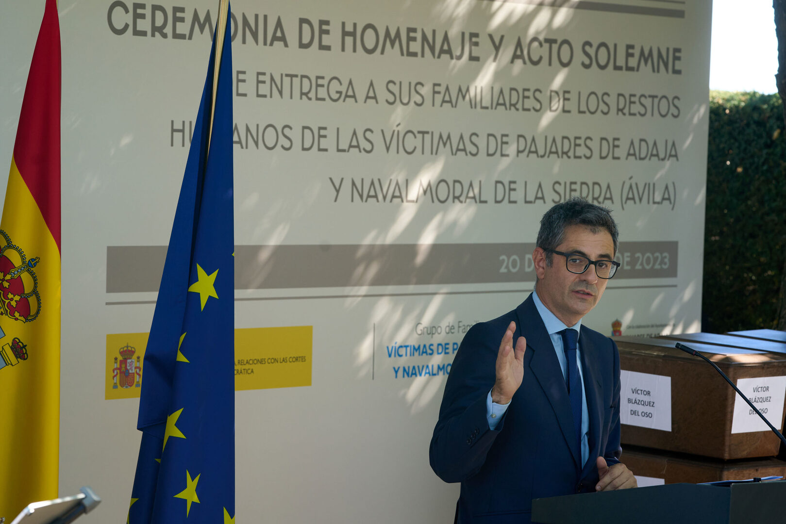 El ministro en funciones de la Presidencia, Relaciones con las Cortes y Memoria Democrática, Félix Bolaños, ha dicho este domingo, en un acto con víctimas de la Guerra Civil y el franquismo de Pajares de Adaja y Navalmoral de la Sierra (Ávila), que es "ridículo" el "empeño" del líder del PP, Alberto Núñez Feijóo, de ir a una investidura que "tanto va a recordar" a la última moción de censura presentada por Vox, con Ramón Tamames como candidato.
