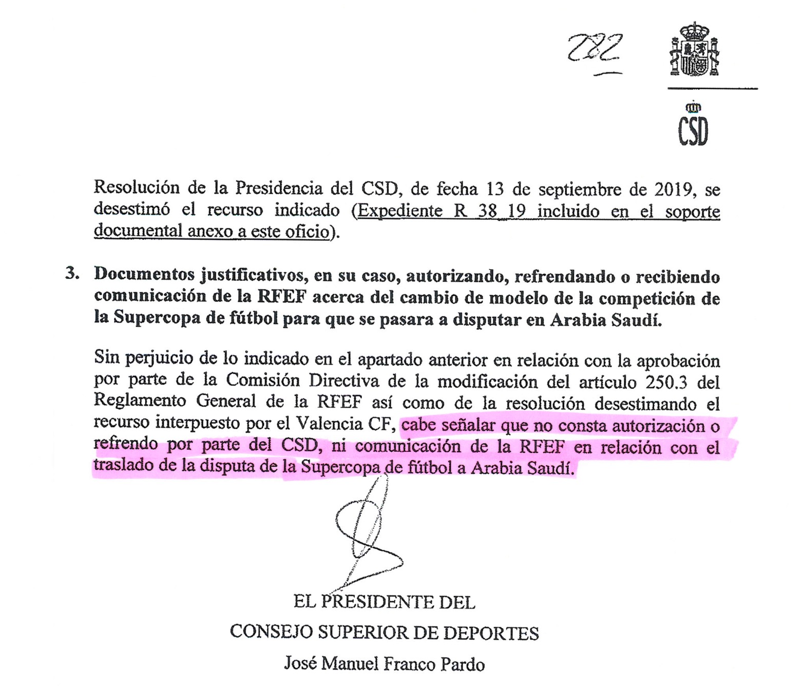 Galán subraya que quiere "hacer especial hincapié en que se adjunta informe del Consejo Superior de Deportes donde el secretario de estado para el Deporte, el señor José Manuel Franco, dice que no consta autorización por parte del Consejo Superior de Deportes para trasladar la Supercopa de España a Arabia Saudí". Y, "por todo los expuesto, se solicita que se dé traslado al Tribunal Administrativo del Deporte de la presente denuncia para que se incoe expediente sancionador contra el presidente de la Federación Española de Fútbol, Don Luis Rubiales Béjar, por una falta muy grave contemplada en el artículo 76.2F de la Ley 10/1990, de 15 de octubre, del Deporte y para que sea sancionado con la destitución del puesto de acuerdo al artículo 79.2C de la Ley 10/1990, de 15 de octubre, del Deporte". La pelota vuelve a estar en el tejado del Gobierno.