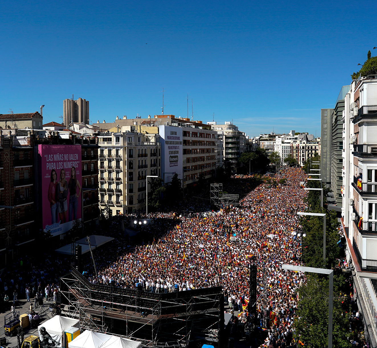 El PP ha desbordado todas las previsiones reuniendo a más de 65.000 personas en Madrid para protestar contra la amnistía, según estimaciones del partido. A tan sólo dos días de la investidura de Alberto Núñez Feijóo, que casi con total seguridad resultará fallida, miles de personas han decidido arroparle y salir a la calle para defender la igualdad, la Constitución y la democracia españolas, en riesgo ante los planes de Pedro Sánchez.