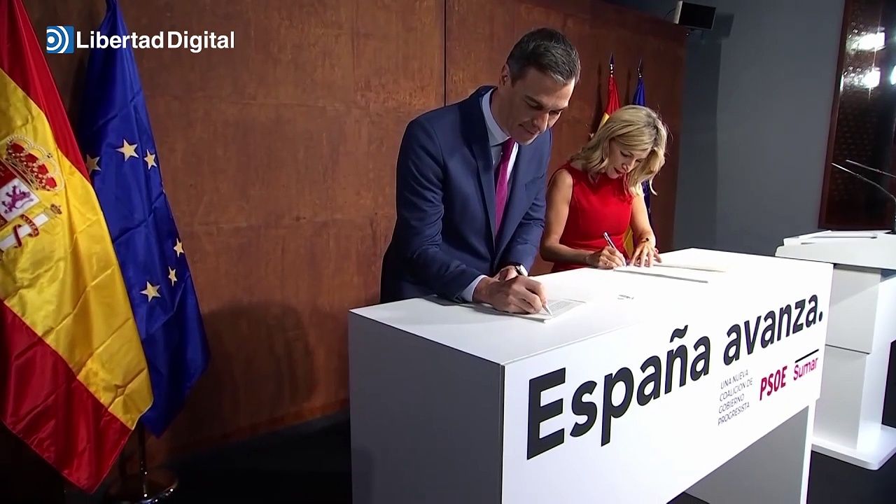 Así lo han anunciado Yolanda Díaz y Pedro Sánchez en la presentación de este acuerdo, donde también se han mostrado convencidos de que podrán formar un nuevo Gobierno de coalición y que por tanto habrá acuerdo para la investidura con el resto de formaciones. El acuerdo de coalición alcanzado también expresamente la apuesta de las dos formaciones por el reconocimiento del Estado palestino así como el "apoyo integral" a Ucrania, dos de los asuntos que más fricciones han provocado en el Gobierno saliente entre los socialistas y Podemos.