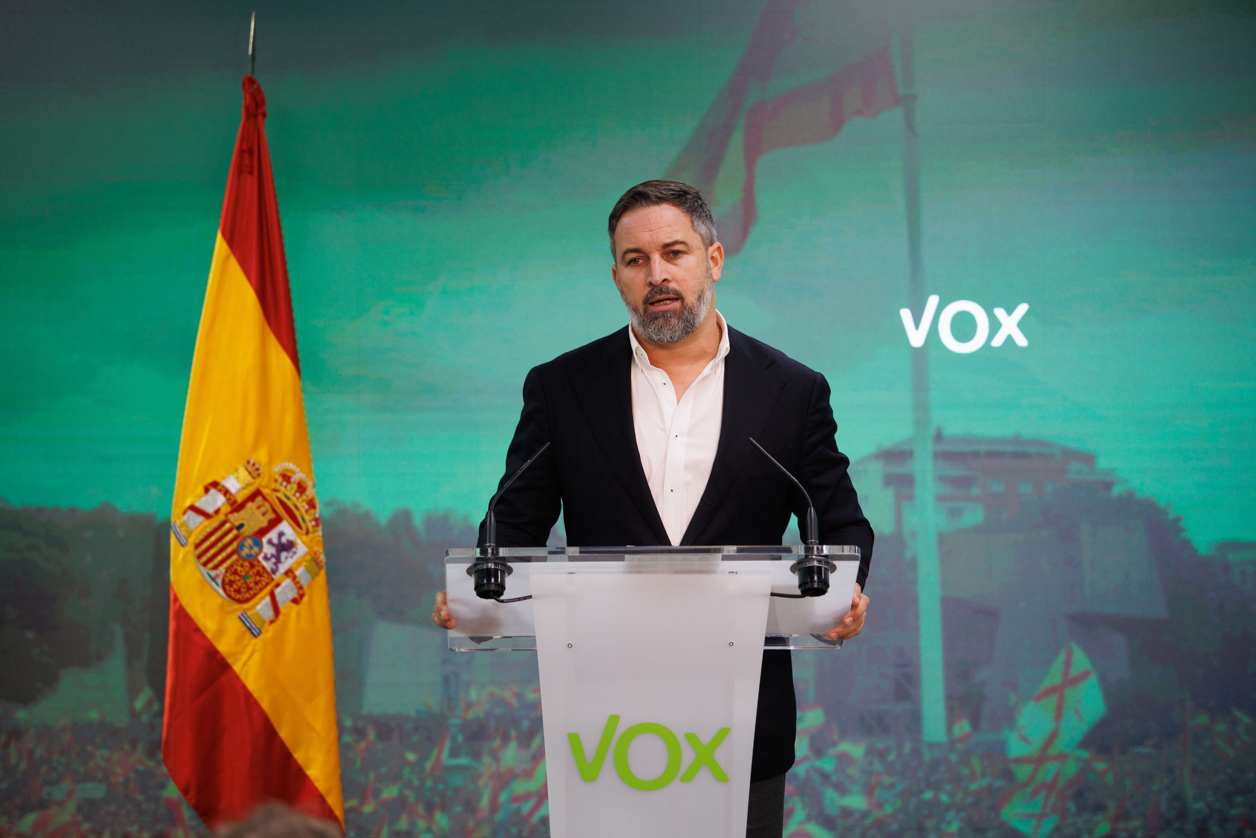 La comparecencia ha tenido lugar después de reunirse en la sede de Vox con los vicepresidentes autonómicos que tienen en Castilla y León, Valencia, Murcia y Aragón, con los que ha consensuado seguir manteniendo movilizaciones en la calle y ha anunciado que se llevarán a cabo declaraciones institucionales para hacer frente a la amnistía de Sánchez.