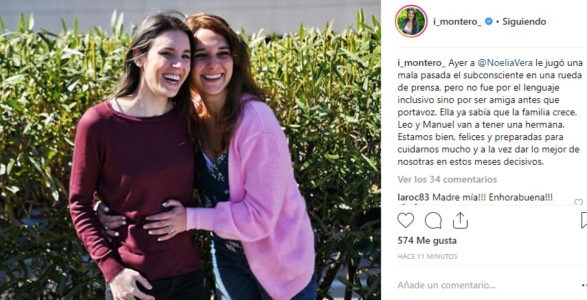 La relación entre Vera e Irene Montero era tan estrecha, que incluso cuando la hoy exministra anunció su primer embarazo, utilizó una foto a su lado, en la que se podía ver a la nueva jefa de prensa de Yolanda Díaz tocándole la barriga y compartiendo risas. De hecho, en aquel mensaje difundido por redes sociales la propia Montero se refería a ella como "amiga antes que portavoz".