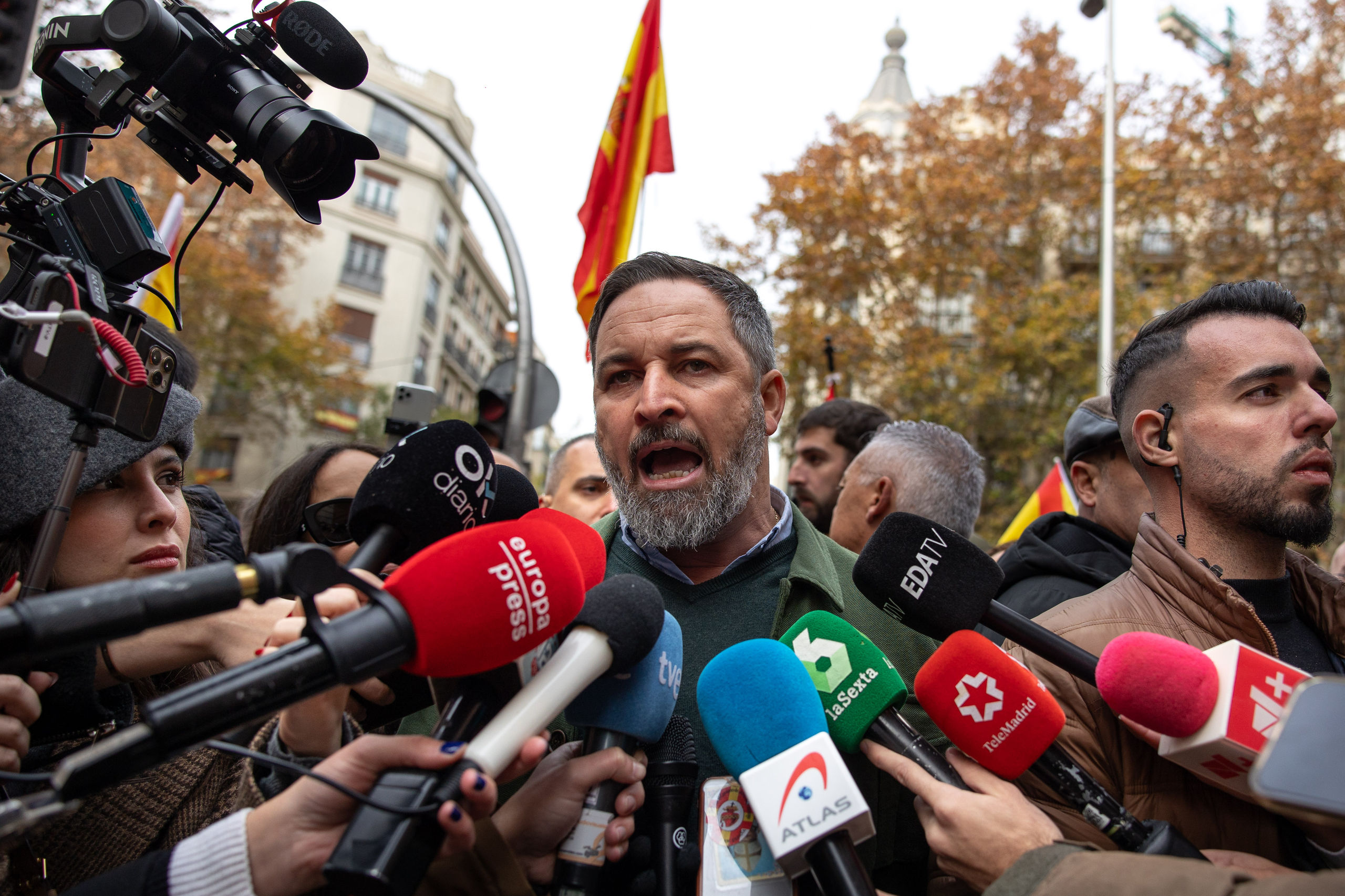 Santiago Abascal hace declaraciones a los medios de comunicación este miércoles, antes de la lectura del manifiesto de la fundación DENAES frente a la sede del PSOE en Ferraz.