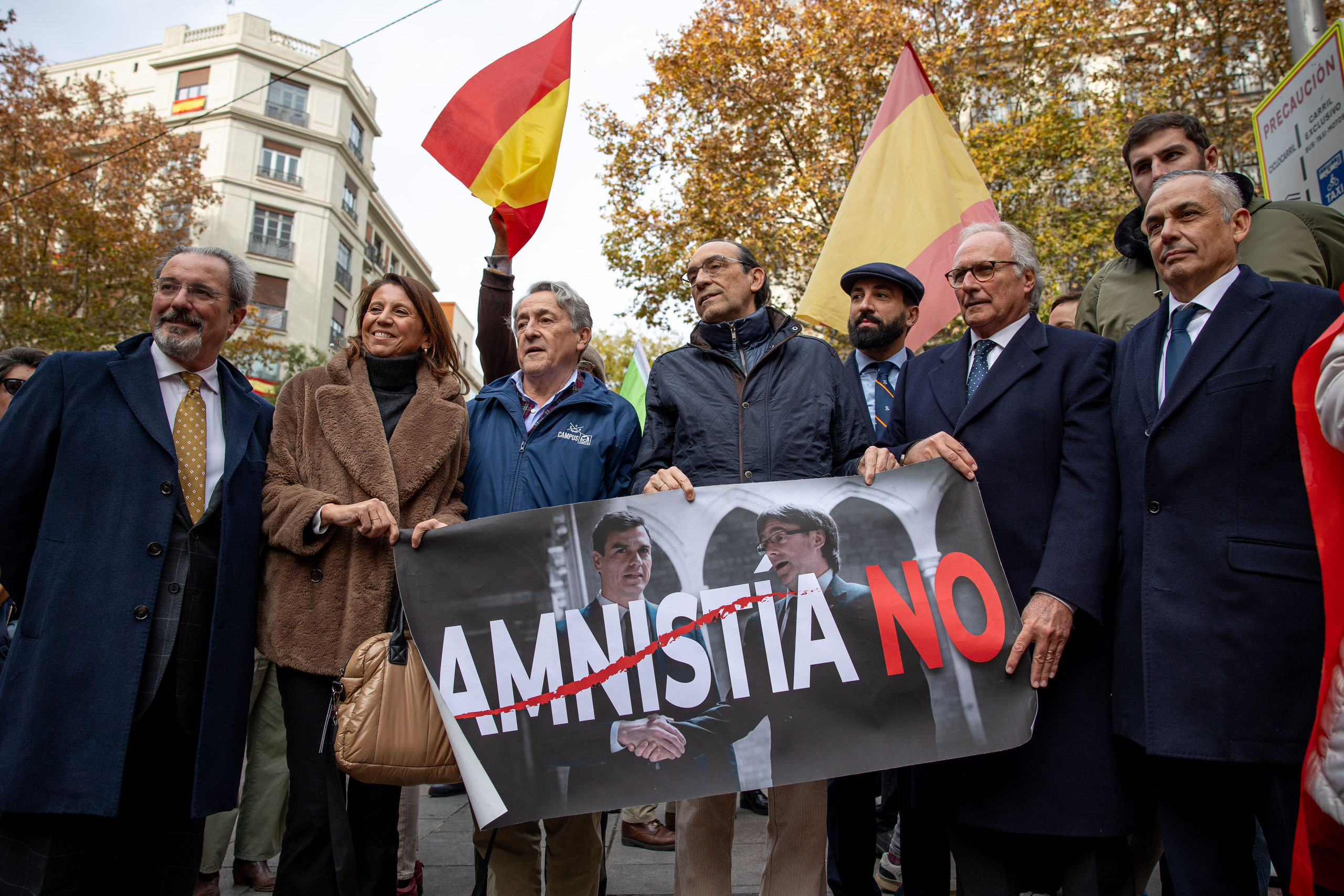 Asistentes a la concentración contra la Ley de Amnistía frente a la sede del PSOE en Madrid, convocada este miércoles por la Fundación DENAES de Vox. EFE/Daniel González