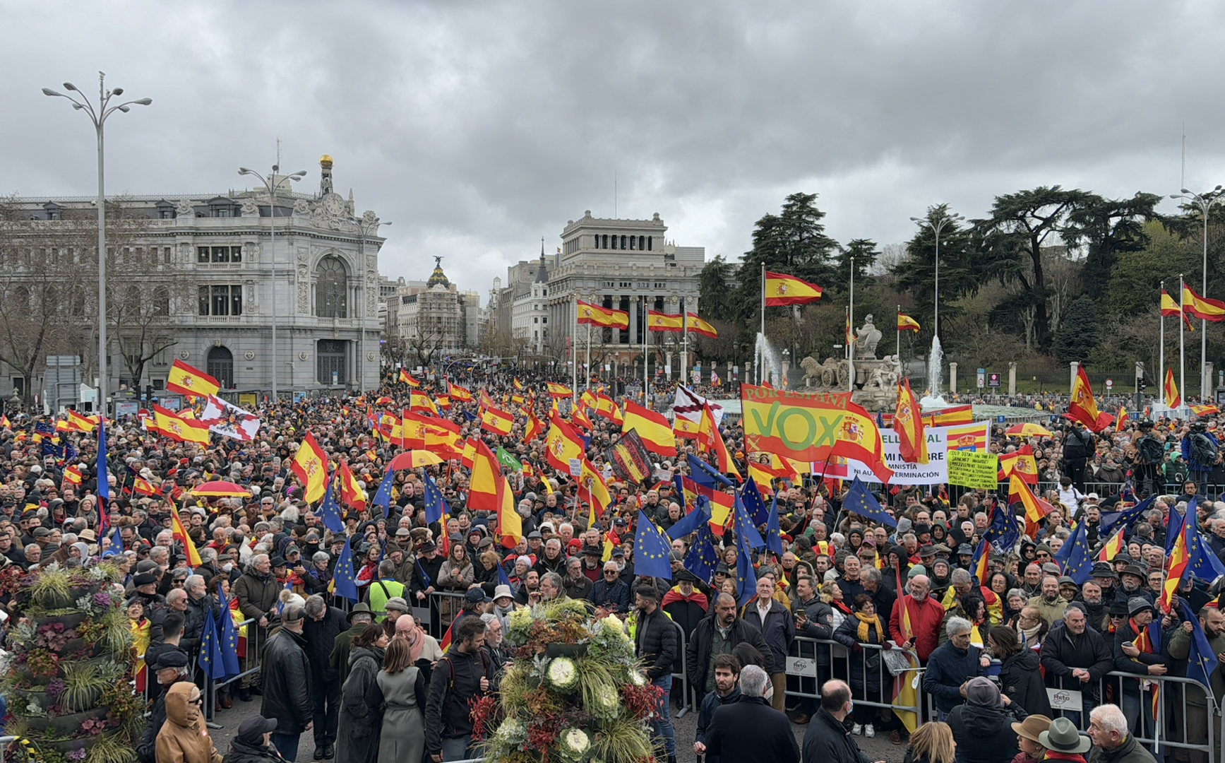 El líder de Vox, Santiago Abascal, ha ironizado con la presencia del Partido Popular en la manifestación de este mediodía en Madrid: "Lo que sorprende francamente es que el PP esté hoy aquí con los españoles, con el pueblo, y el miércoles esté en Bruselas con (Félix) Bolaños (ministro de la Presidencia, Justicia y Relaciones con las Cortes". Tamibén ha añadido: "Yo no sé si estará aquí el señor Pons o ya está cogiendo el avión para Bruselas. Lo que sorprende es esa estafa permanente que lo único que hace es generar confusión. Por nuestra parte no vamos a ofrecer ninguna tregua a este Gobierno, vamos a estar en las calles, vamos a estar en los tribunales", ha señalado Abascal