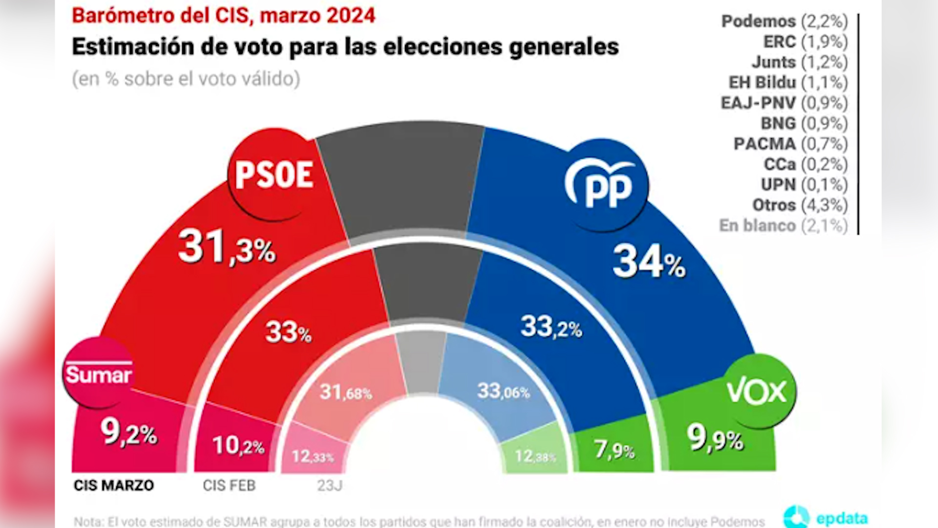 El Barómetro de opinión del Centro de Investigaciones Sociológicas, el primero tras la primera votación de la Ley de Amnistía en el Pleno del Congreso, el estallido del 'caso Koldo' y las elecciones gallegas, sitúa al PP casi tres puntos por encima del PSOE, rompiendo el empate técnico del mes anterior.