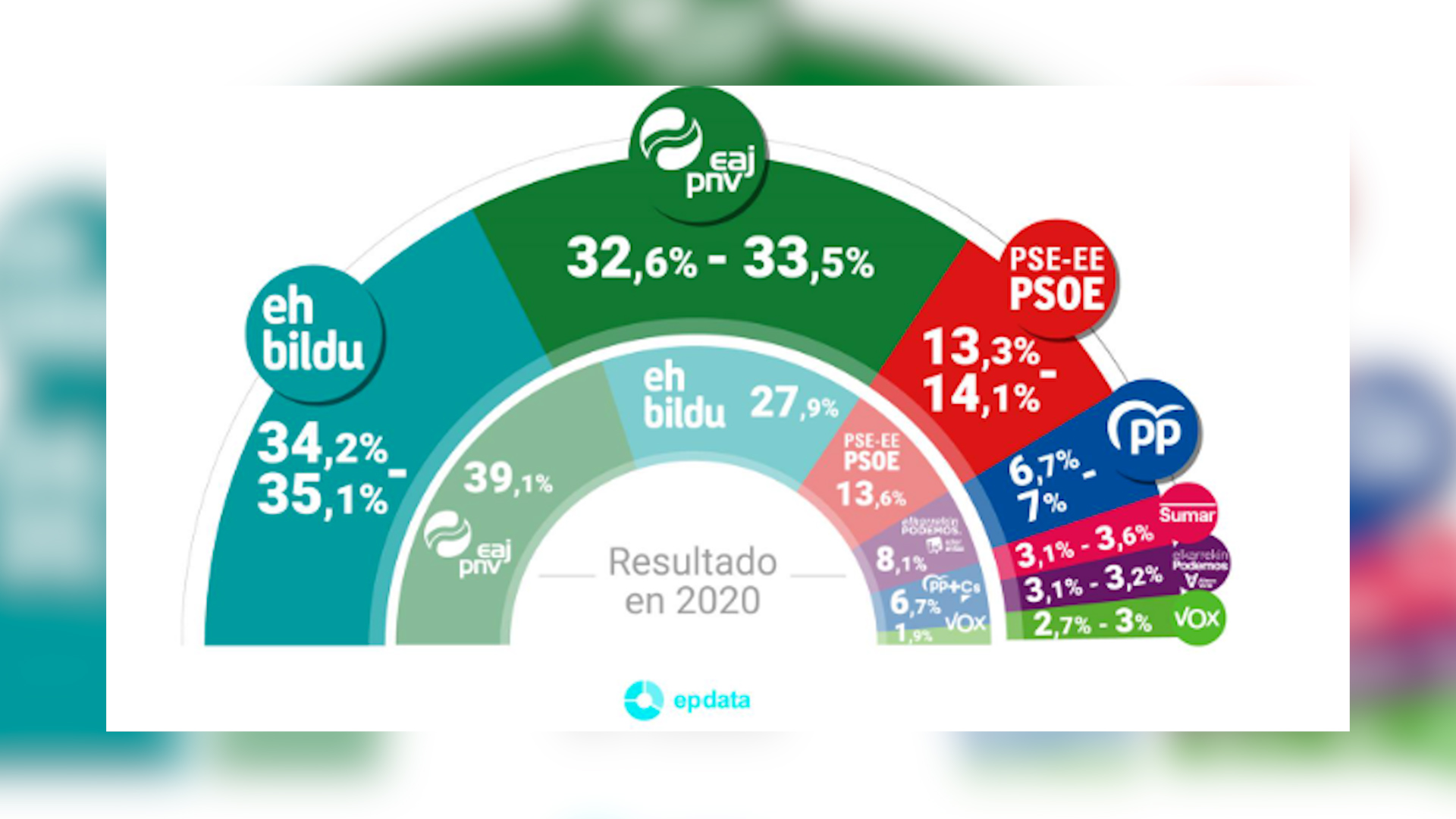EH Bildu lograría en las próximas elecciones al Parlamento Vasco del próximo 21 de abril entre el 34,2 y el 35,1% de los votos y superaría ligeramente al PNV, que obtendría entre el 32,6 y el 33,5% de los sufragios. Por tanto, la diferencia entre ambas formaciones nacionalistas, que se disputan la hegemonía política en Euskadi, sería de décimas, aunque la lista encabezada por Pello Otxandiano daría el sorpasso en voto a la candidatura liderada por Imanol Pradales.