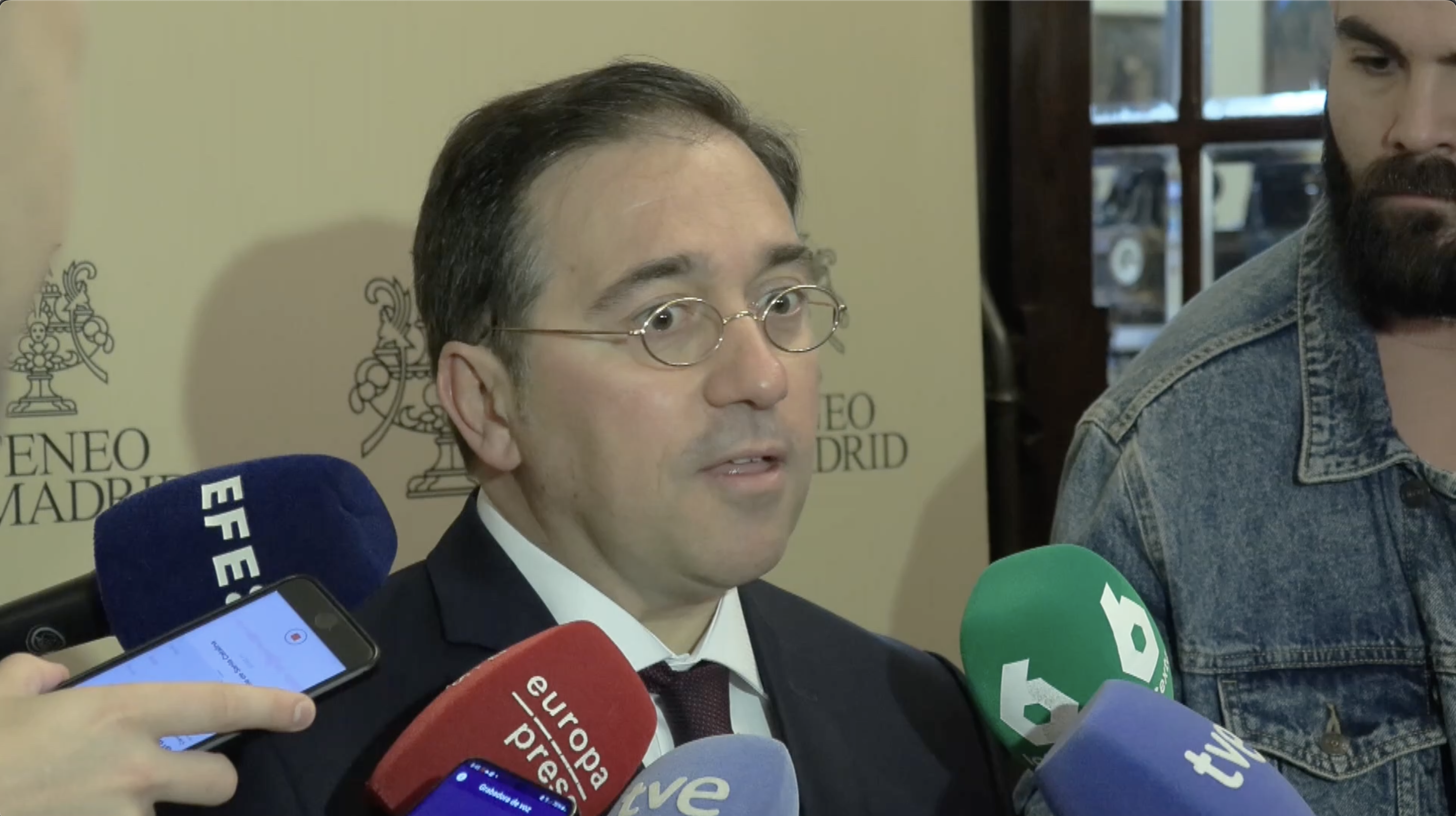 José Manuel Albares: "Las decisiones del Consejo de Ministros nunca se anticipan. Estamos hablando con varios de nuestros colegas europeos para analizar el mejor momento de hacer ese reconocimiento", afirmó el ministro en declaraciones a periodista antes de asistir a un acto con motivo del Día de Europa con el Alto Representante para la Política Exterior de la UE, Josep Borrell.