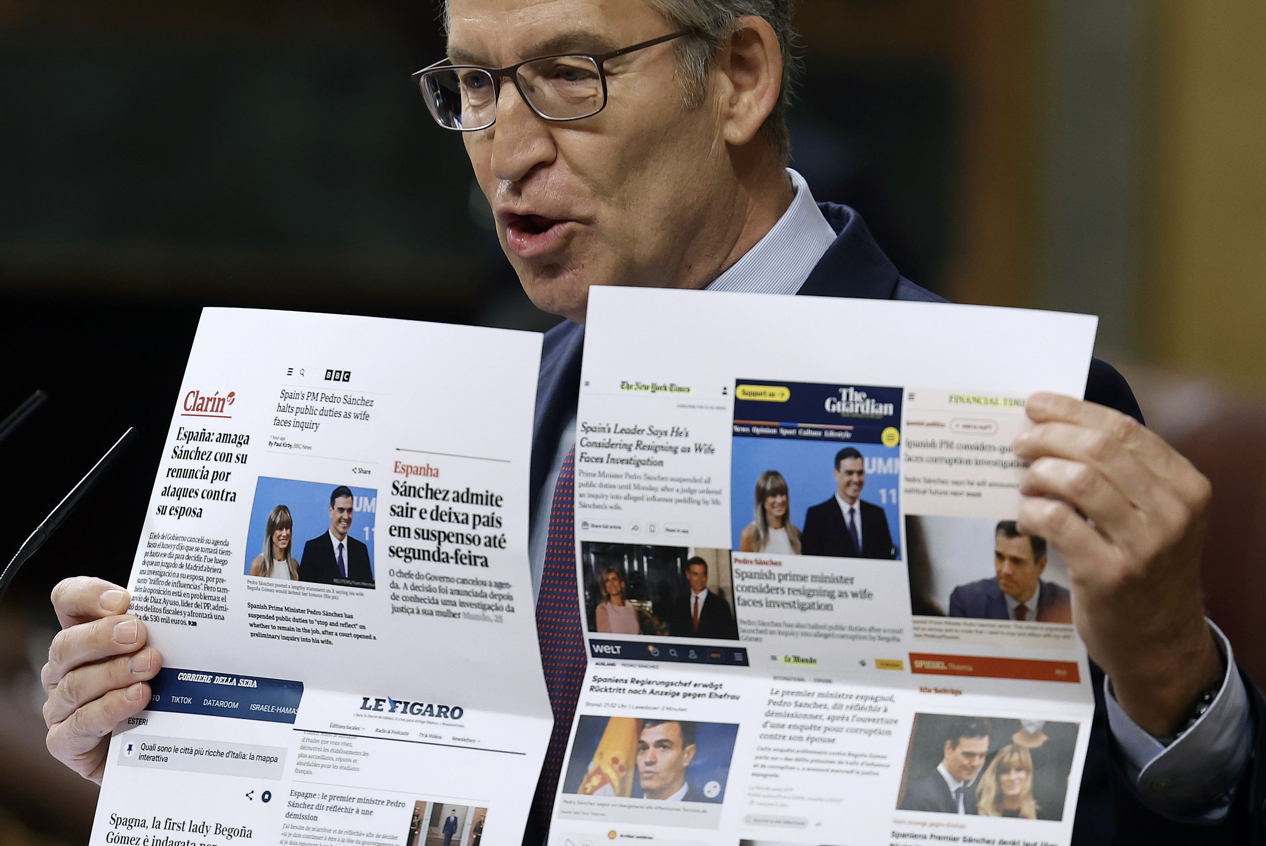 Augurando una nueva "estrategia peliculera", Feijóo ha acusado a Sánchez de "sobreactuación" y de "avergonzar a todos los españoles", mostrándole las portadas de la prensa internacional que recogieron sus cinco días de reflexión hablando de "la corrupción que afecta a su mujer". "Ese es su mayor hit en la prensa extranjera", le ha afeado el líder del PP, que no se ha dejado en el tintero ninguno de los asuntos de política exterior que se abordaba también en el Pleno.