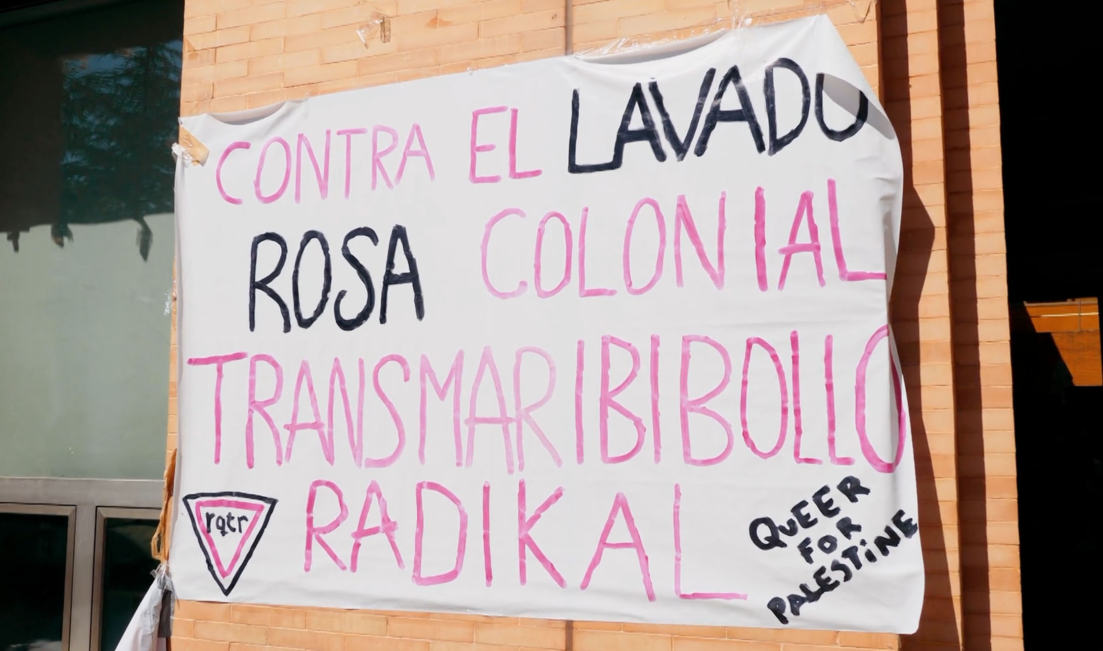 Libertad Digital ha visitado esta acampada, ha preguntado a sus portavoces y ha contemplado la cartelería increíblemente agresiva que la acompaña. Hemos hablado de las razones para mantenerse acampados que tienen los estudiantes y hemos escuchado explicaciones sobre por qué el movimiento LGTBI no tiene que apoyar a Israel –el único país en más miles de kilómetros a la redonda en el que los gays pueden vivir su vida sin esconderse–, sino que tiene que estar del lado de los palestinos.