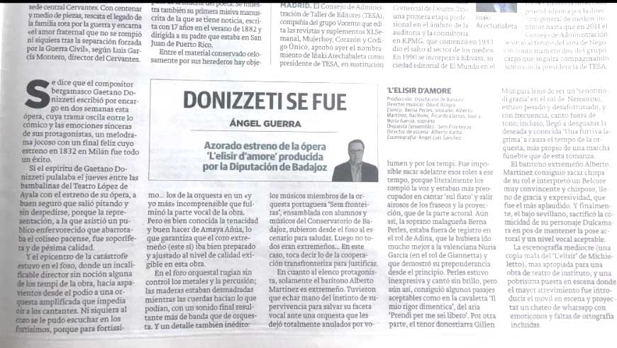 "Si el espíritu de Gaetano Donizetti pululaba el jueves entre las bambalinas del Teatro López de Ayala con el estreno de su ópera, a buen seguro que salió pitando y sin despedirse", escribía el crítico Ángel Guerra, que calificaba la representación de "soporífera" y "de pésima calidad" y apuntaba al culpable sin rodeos. "El epicentro de la catástrofe estuvo en el foso, donde un incalificable director, sin noción alguna de los tempi de la obra, hacía aspavientos desde el podio a una orquesta amplificada que impedía o ir a los cantantes", se quejaba.