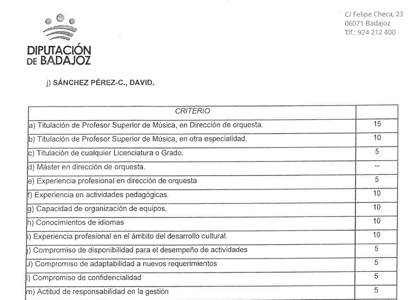 "a) Titulación de Profesor Superior de Música, en Dirección de orquesta. 15 puntos". El máximo regulado para este concepto. "B) Titulación de Profesor Superior de Música, en otra especialidad. 10 puntos". El máximo posible. "C) Titulación de cualquier Licenciatura o Grado: 5 puntos". El máximo. "Experiencia profesional en dirección de orquesta"; "experiencia en actividades pedagógicas"; "capacidad de organización de equipos"; "experiencia profesional en el ámbito del desarrollo cultural"… Y todo un suma y sigue de máximas calificaciones según el baremo regulado por la propia Diputación de Badajoz.