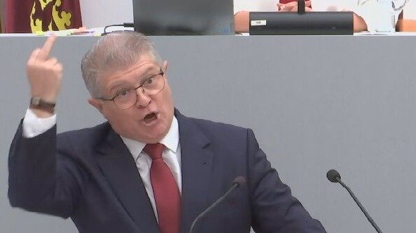 El socialista murciano José Vélez hace una peineta a López Miras en la Asamblea Regional