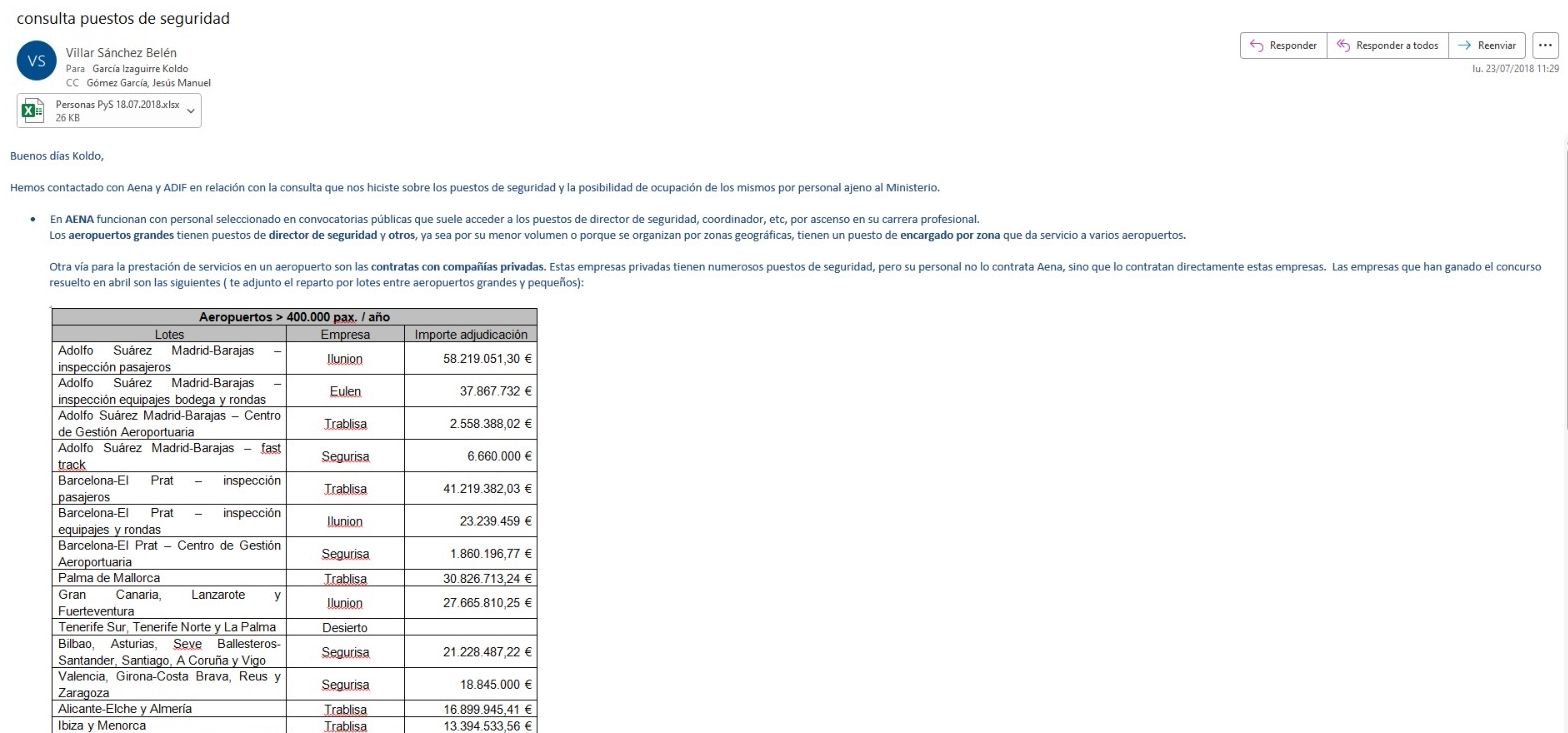 El texto del mail muestra cercanía y señala lo siguiente: "Buenos días Koldo. Hemos contactado con Aena y ADIF en relación con la consulta que nos hiciste sobre los puestos de seguridad y la posibilidad de ocupación de los mismos por personal ajeno al Ministerio. En AENA funcionan con personal seleccionado en convocatorias públicas que suele acceder a los puestos de director de seguridad, coordinador, etc, por ascenso en su carrera profesional.