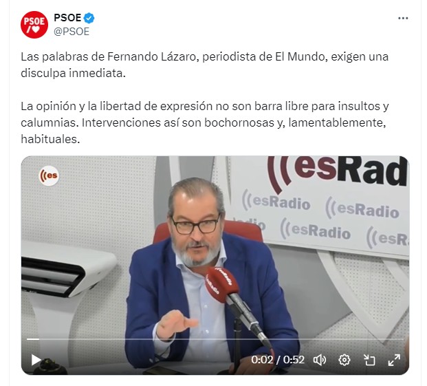 En el infame tuit, el PSOE exige "una disculpa inmediata" a Lázaro y sostiene que "la opinión y la libertad de expresión no son barra libre para insultos y calumnias". "Intervenciones así son bochornosas y, lamentablemente, habituales". Por su parte, el aludido ha respondido de la siguiente manera: