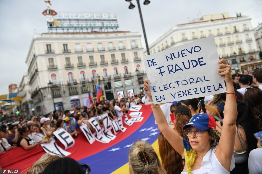 Los venezolanos que viven en España han convocado esta tarde una concentración en la Puerta del Sol para protestar contra el supuesto fraude electoral en el estado sudamericano. Cientos de personas, junto a destacadas figuras de la posición a Nicolás Maduro, han reclamado en el centro de Madrid el triunfo del candidato opositor Edmundo González.