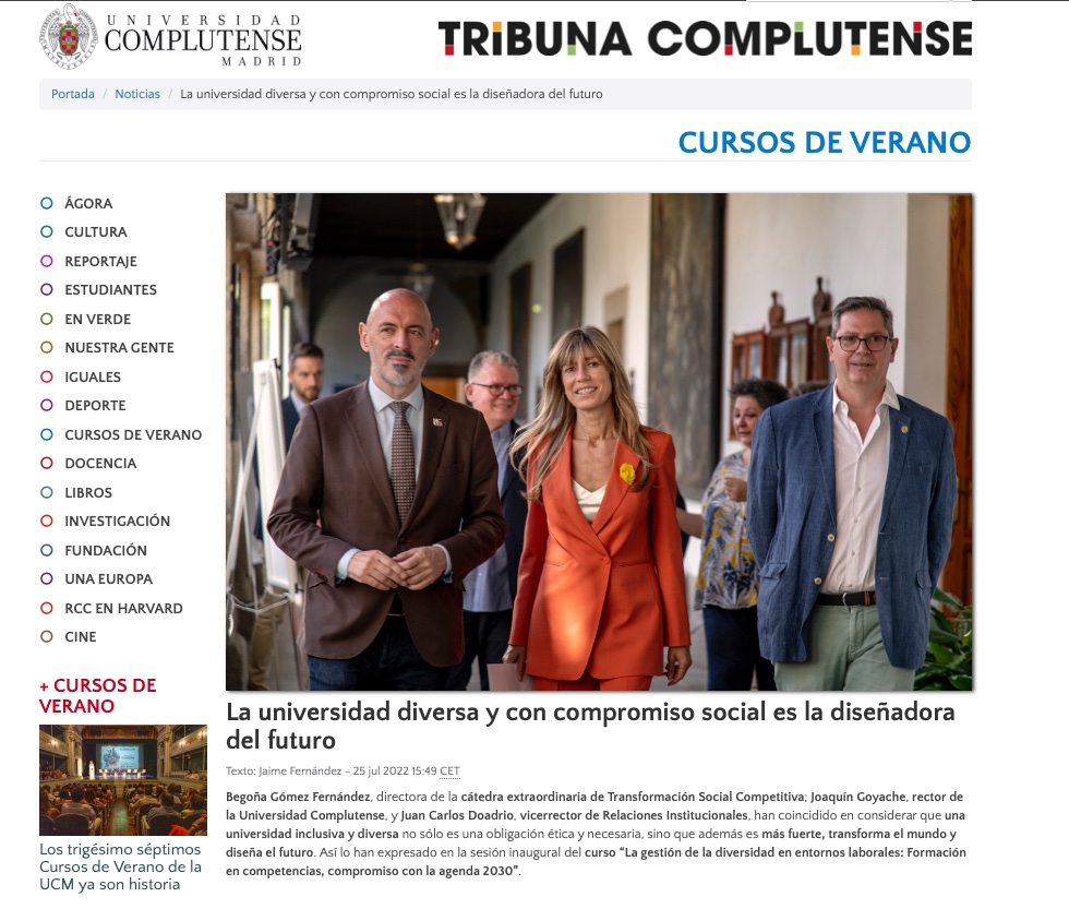 "La universidad diversa y con compromiso social es la diseñadora del futuro". Ese fue el lema vendido en aquel evento. Y la estrella principal fue Begoña Gómez, "directora de la cátedra extraordinaria de Transformación Social Competitiva", que, de la mano de "Joaquín Goyache, rector de la Universidad Complutense, y Juan Carlos Doadrio, vicerrector de Relaciones Institucionales, han coincidido en considerar que una universidad inclusiva y diversa no sólo es una obligación ética y necesaria, sino que además es más fuerte, transforma el mundo y diseña el futuro". Así lo expresaron en la sesión inaugural del curso "La gestión de la diversidad en entornos laborales: Formación en competencias, compromiso con la agenda 2030".