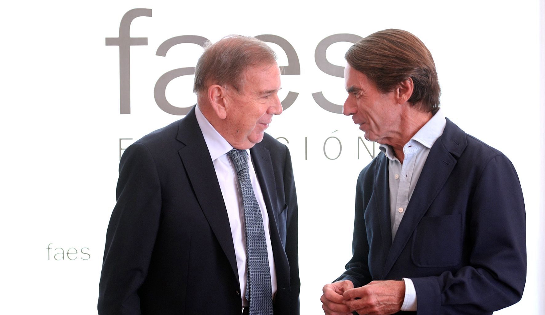 El expresidente del Gobierno y presidente de la Fundación FAES, José María Aznar, ha mantenido un encuentro esta mañana con el líder venezolano Edmundo González Urrutia, en la sede de FAES. Aznar, como también hizo la semana pasada el expresidente, Mariano Rajoy, ha expresado su apoyo para "que el exilio de Edmundo González acabe cuanto antes" para que pueda ejercer como presidente de Venezuela "en paz y libertad", en detrimento del dictador Nicolás Maduro y el régimen chavista que está ejerciendo una cruel represión contra la ciudadanía.