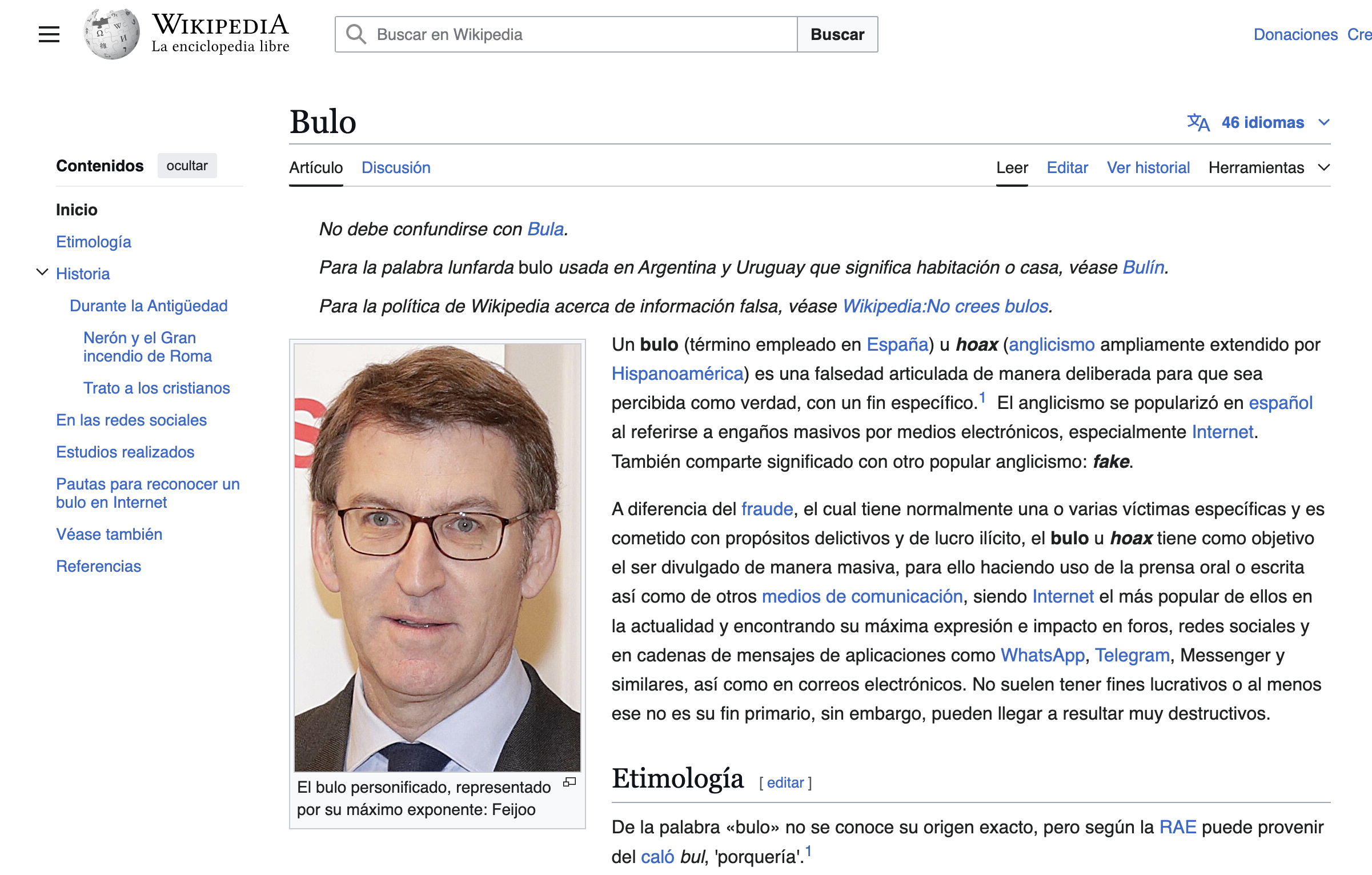 "Un bulo (término empleado en España) u hoax (anglicismo ampliamente extendido por Hispanoamérica) es una falsedad articulada de manera deliberada para que sea percibida como verdad, con un fin específico. El anglicismo se popularizó en español al referirse a engaños masivos por medios electrónicos, especialmente Internet. También comparte significado con otro popular anglicismo: fake", es la definición utilizada por la página oficial de Wikipedia para la palabra bulo.