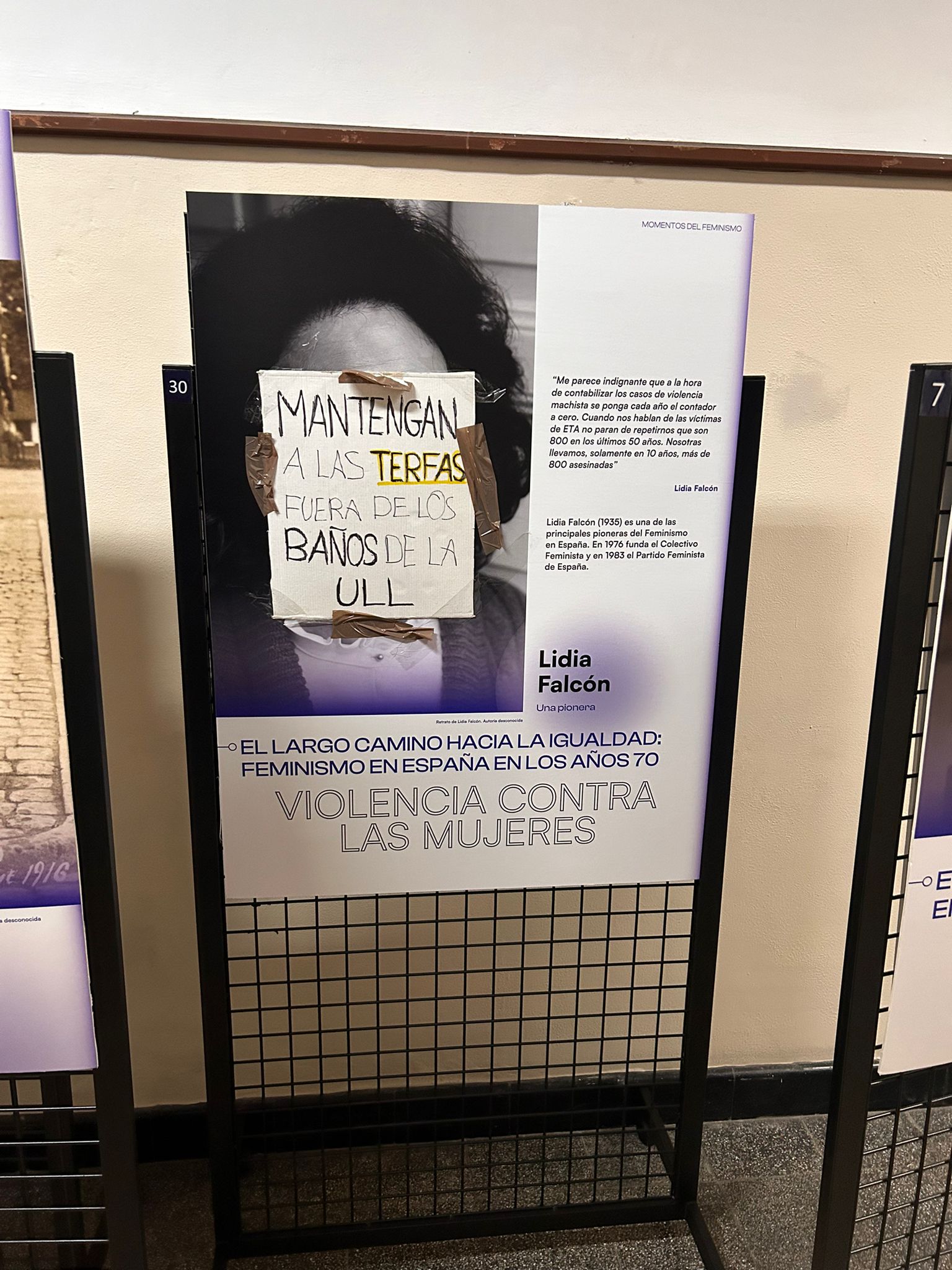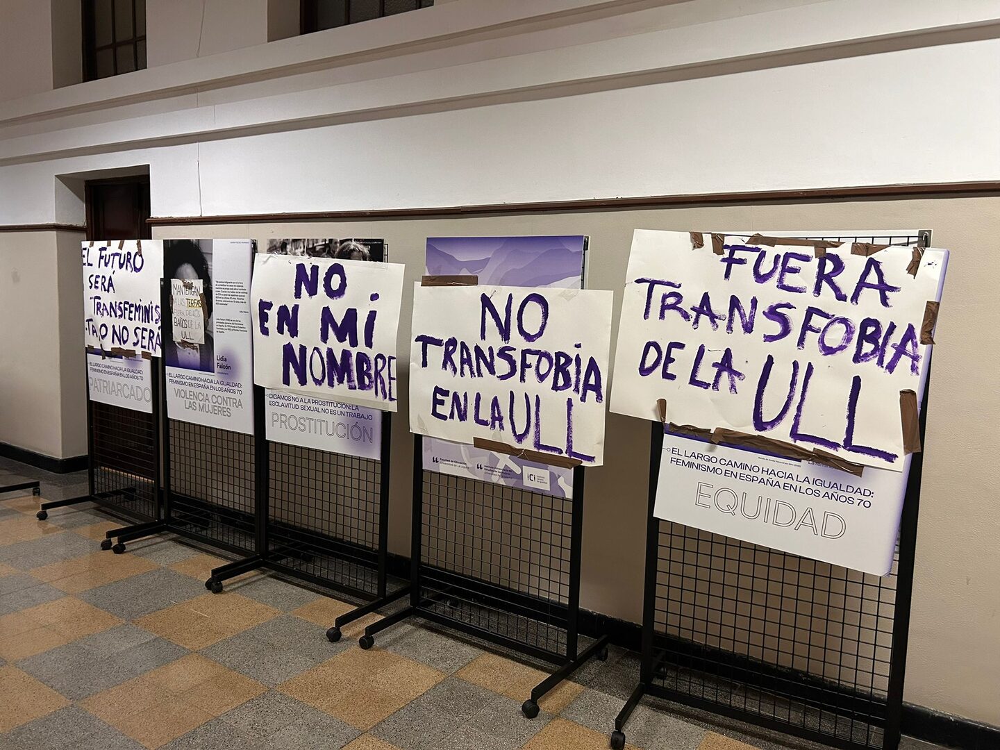 La Ley Trans ha vuelto al foco de la polémica esta semana al calor de la celebración del Día Internacional de la Eliminación de la Violencia contra la Mujer. Con motivo del 25-N, la Universidad de La Laguna había programado para estos días una exposición titulada "Momentos del feminismo". Sin embargo, los carteles de la misma no solo han sido "objeto de actos vandálicos por parte de un grupo de transactivistas", como muestran las imágenes publicadas en redes sociales, sino que, además, las ponentes y mujeres que asistieron a la conferencia "fueron increpadas al terminar", según denuncian desde Docentes Feministas por la Coeducación (Dofemco).