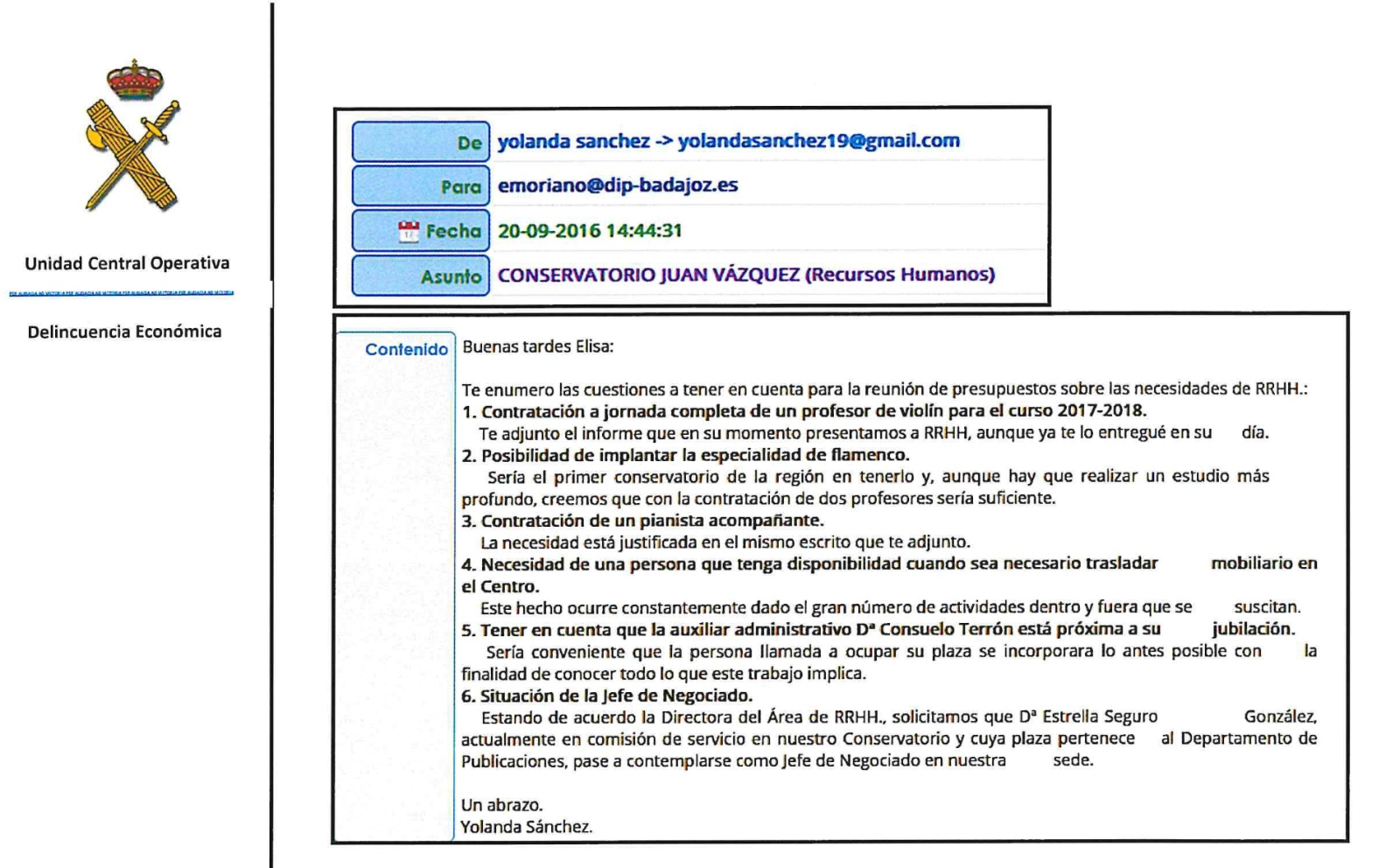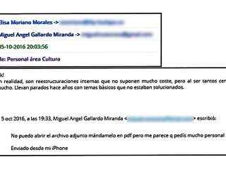 Ahora la BUCo ha detectado un mail previo, de septiembre de 2016, donde se explican, una por una, las necesidades reales que tenían en los conservatorios: profesor de violín, mover muebles y hasta un experto en flamenco. Ni ópera, ni jefes, ni directores de nada.
