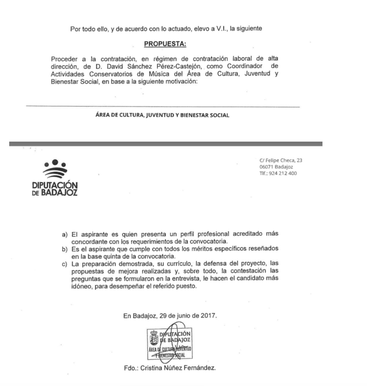 "Es el aspirante que cumple con todos los méritos específicos reseñados en la base quinta de la convocatoria. La preparación demostrada, su currículo, la defensa del proyecto, las propuestas de mejora realizadas y, sobre todo, la contestación las preguntas que se formularon en la entrevista, le hacen el candidato más idóneo, para desempeñar el referido puesto", firmó Cristina Núñez, "en Badajoz, 29 de junio de 2017. DIPUTACIÓN DE BADAJOZ. ÁREA DE CULTURA JUVENTUD Y BIENESTAR SOCIAL".
